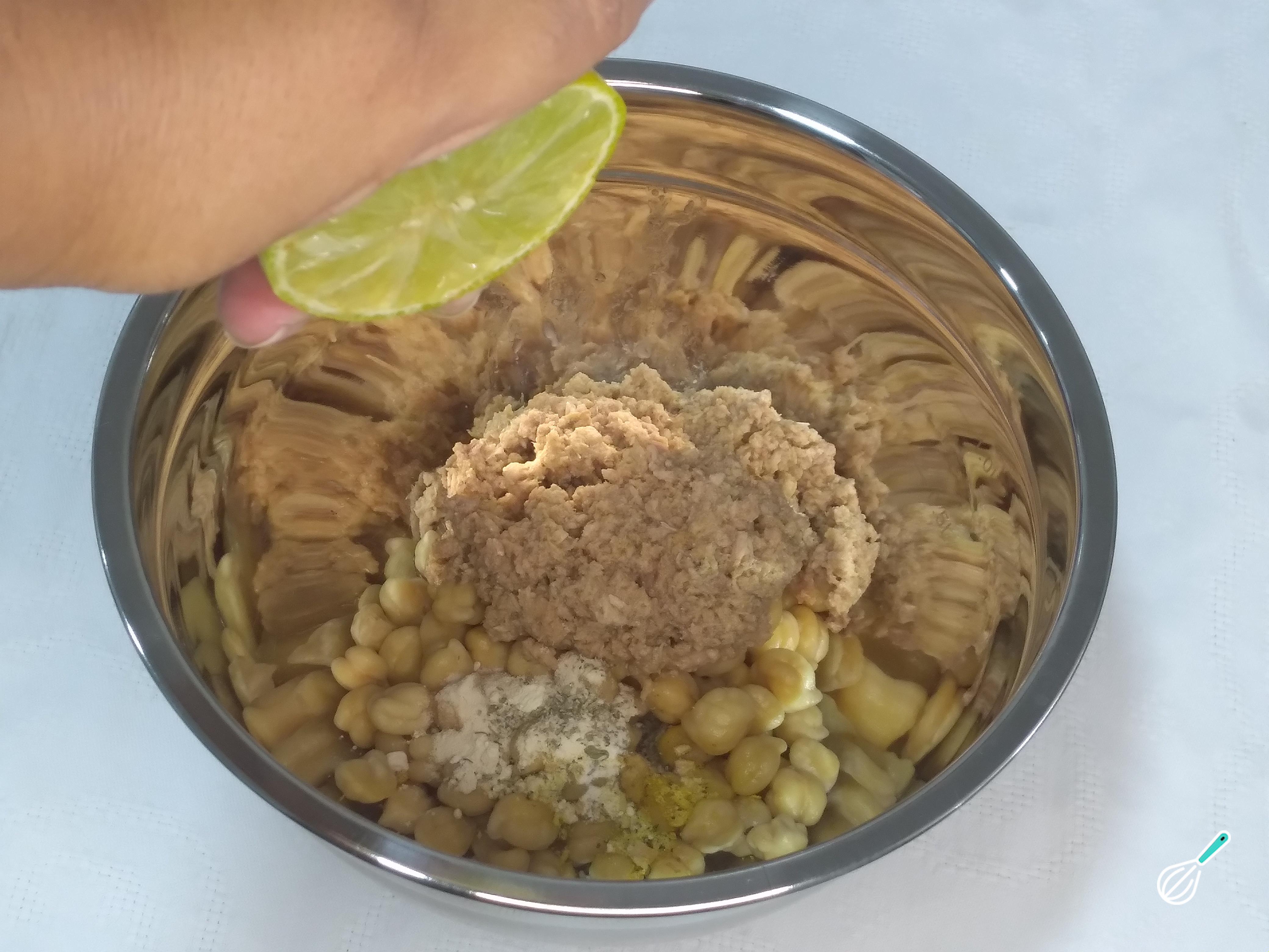 Em uma tigela, coloque o grão de bico, o atum, os temperos, sal e o suco do limão. Mexa bem para incorporar os sabores.