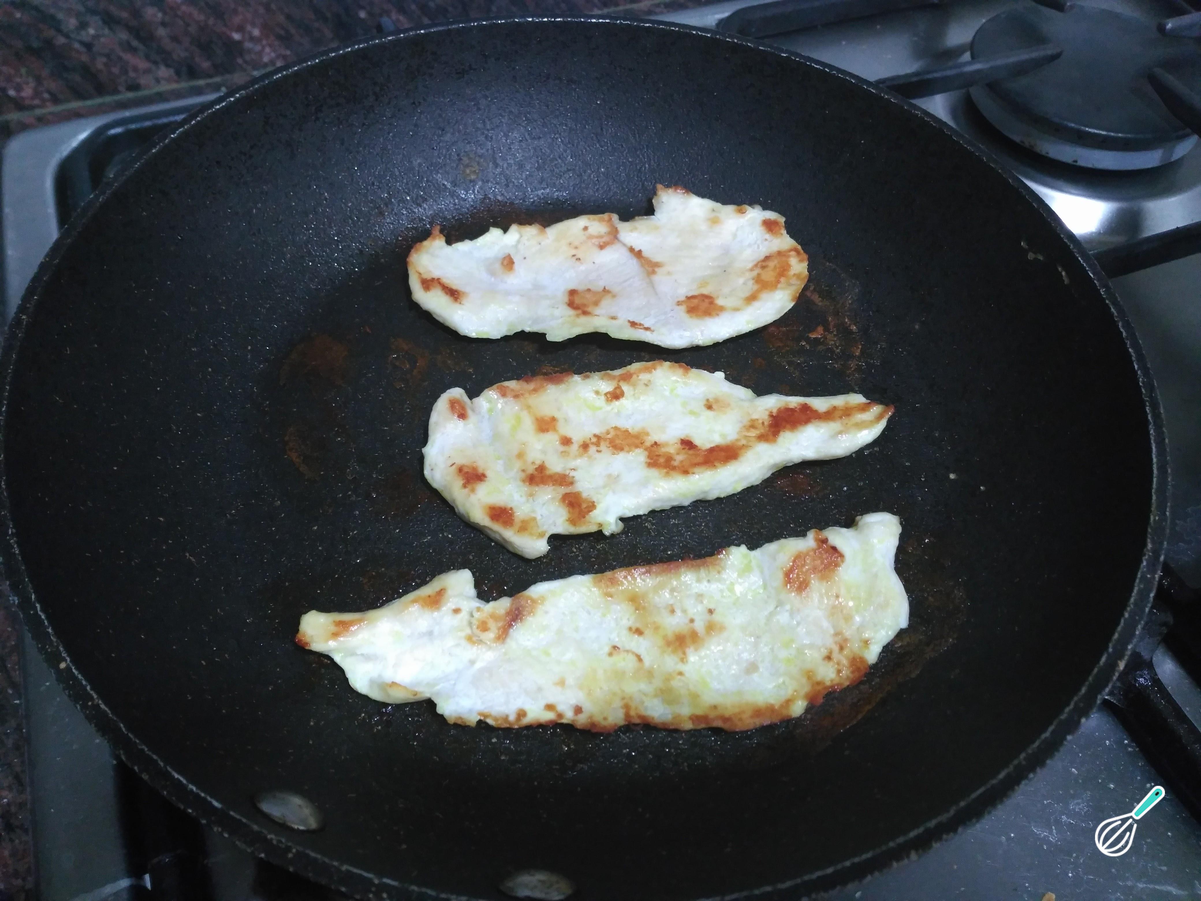 Numa frigideira à parte, também com um fio de azeite, cozinhe os filés de frango temperados com sal e pimenta a gosto. Quando estiverem douradinhos retire, corte em pedaços e adicione ao refogado de cebola e pimentão.
