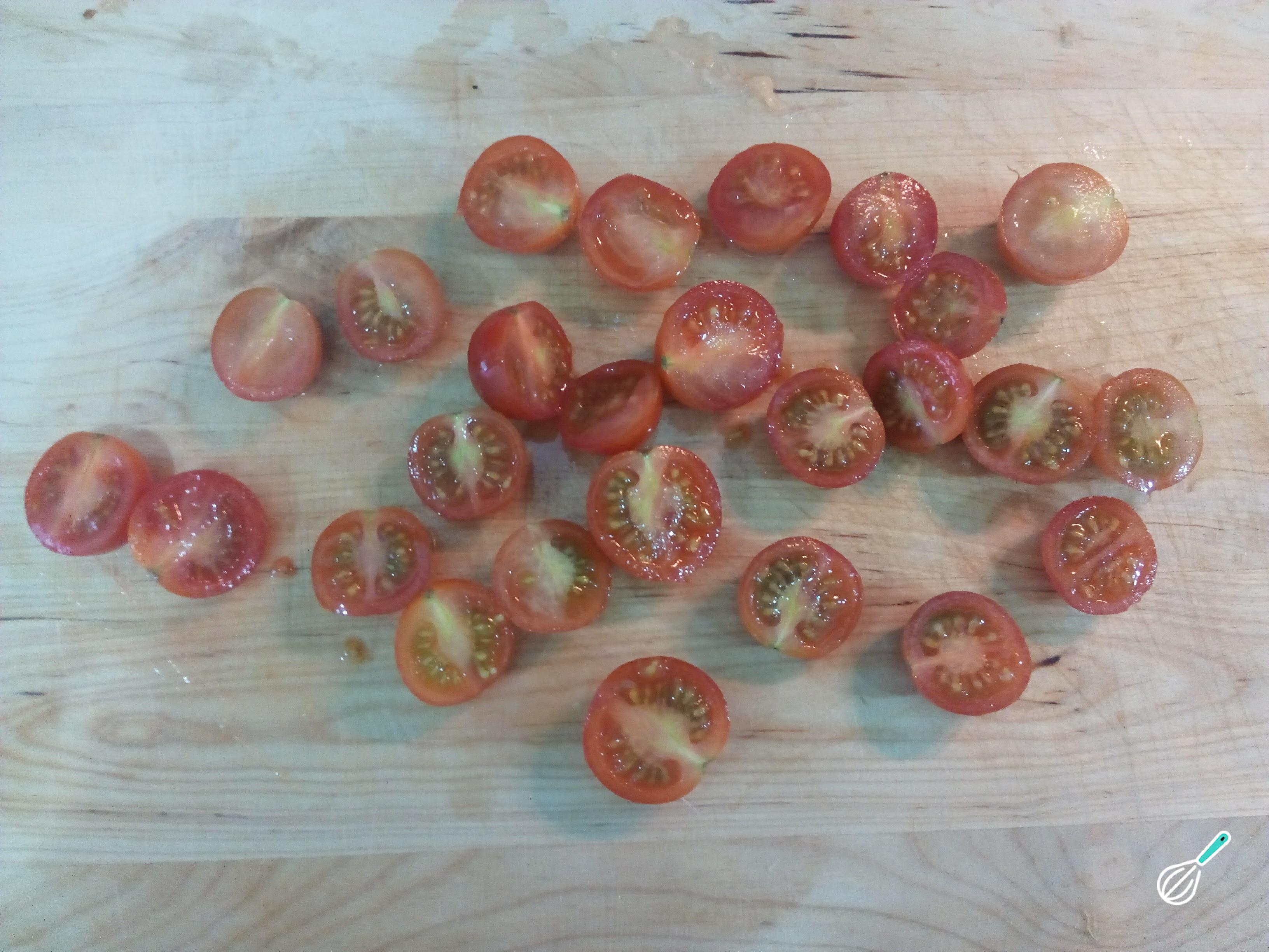 Enquanto isso prepare os restantes ingredientes desta receita salada de verão: lave os tomates, corte em metades e pique a cebolinha. Adicione estes ingredientes à panela, junto com o grão, e salteie por mais 1-2 minutos.