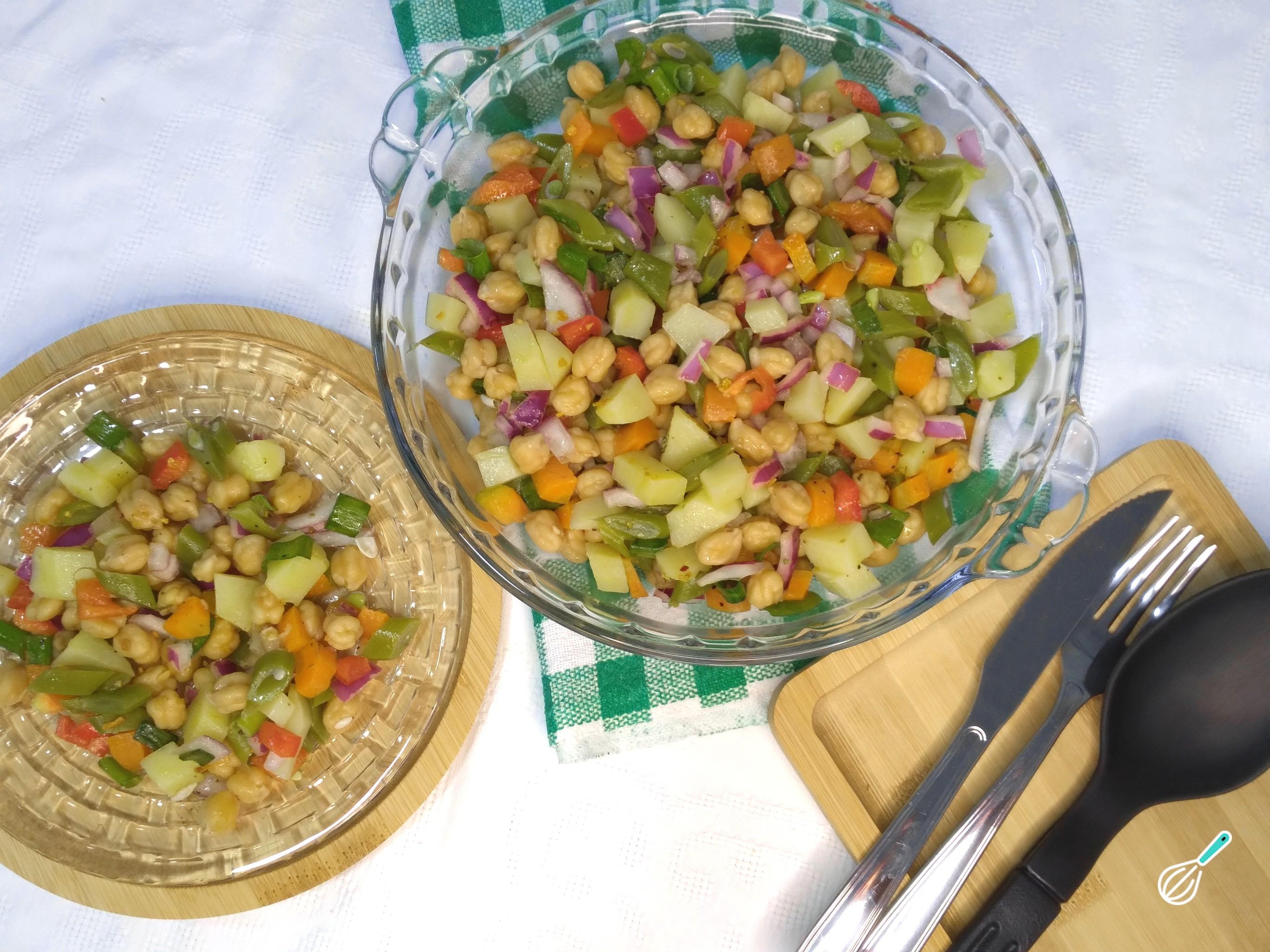 Sua salada de grão de bico com legumes está pronta. Um acompanhamento perfeito que combina com qualquer tipo de proteína. Sirva gelada ou em temperatura ambiente. Fará o maior sucesso em sua mesa.