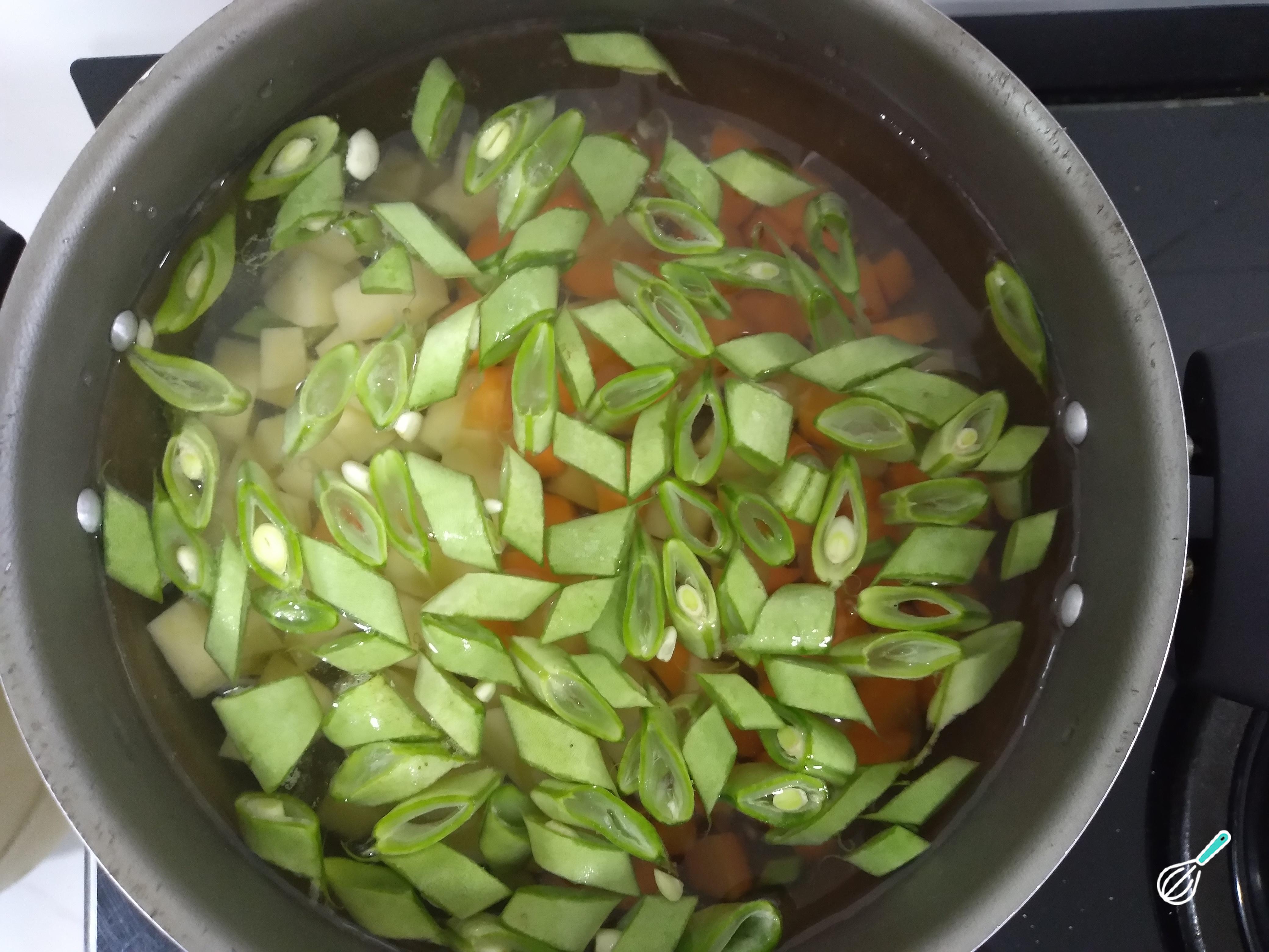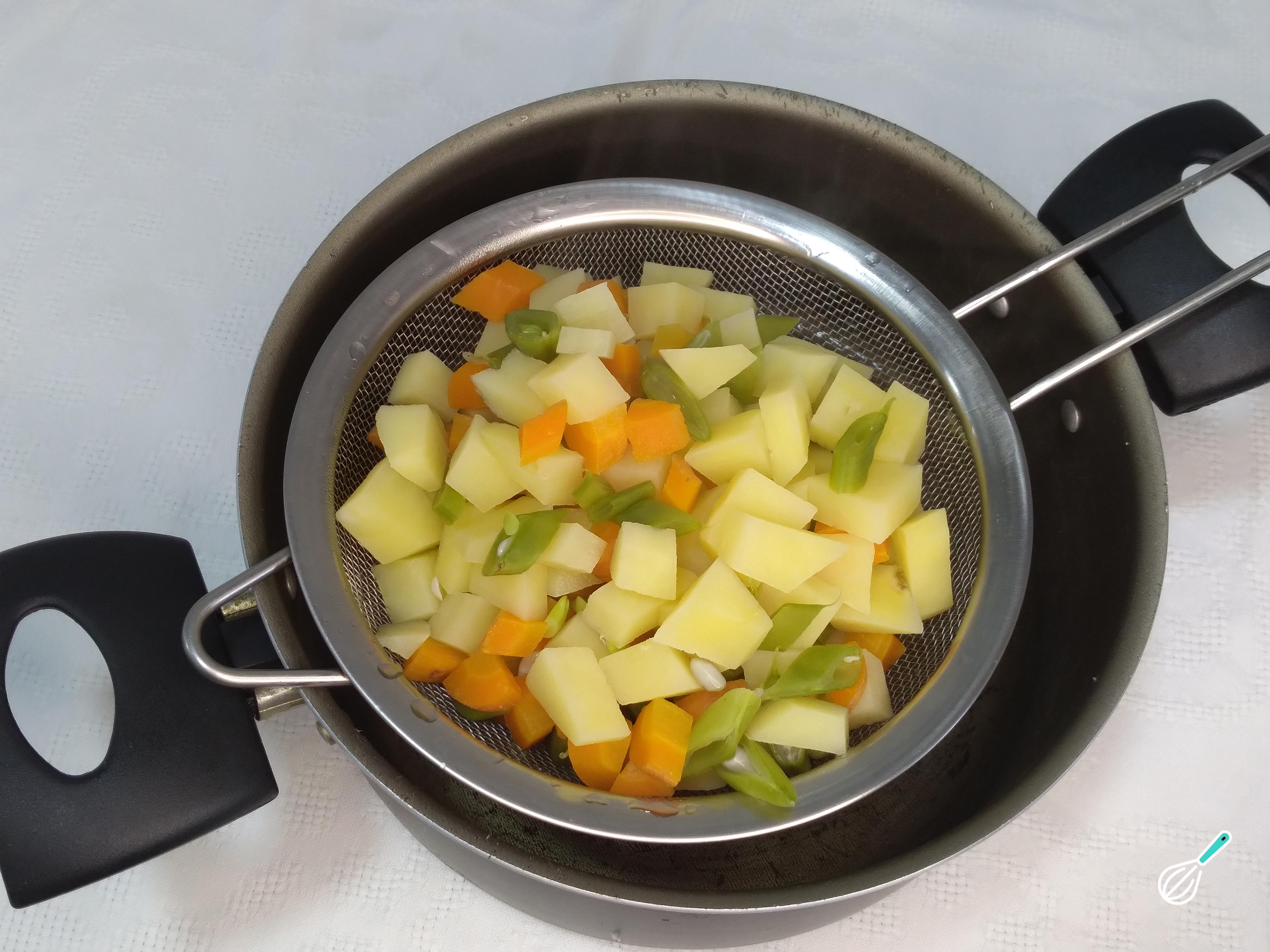 Dica: Coloque a cenoura e a batata em água, depois de cortadas. Assim, evitará que fiquem escurecidas.