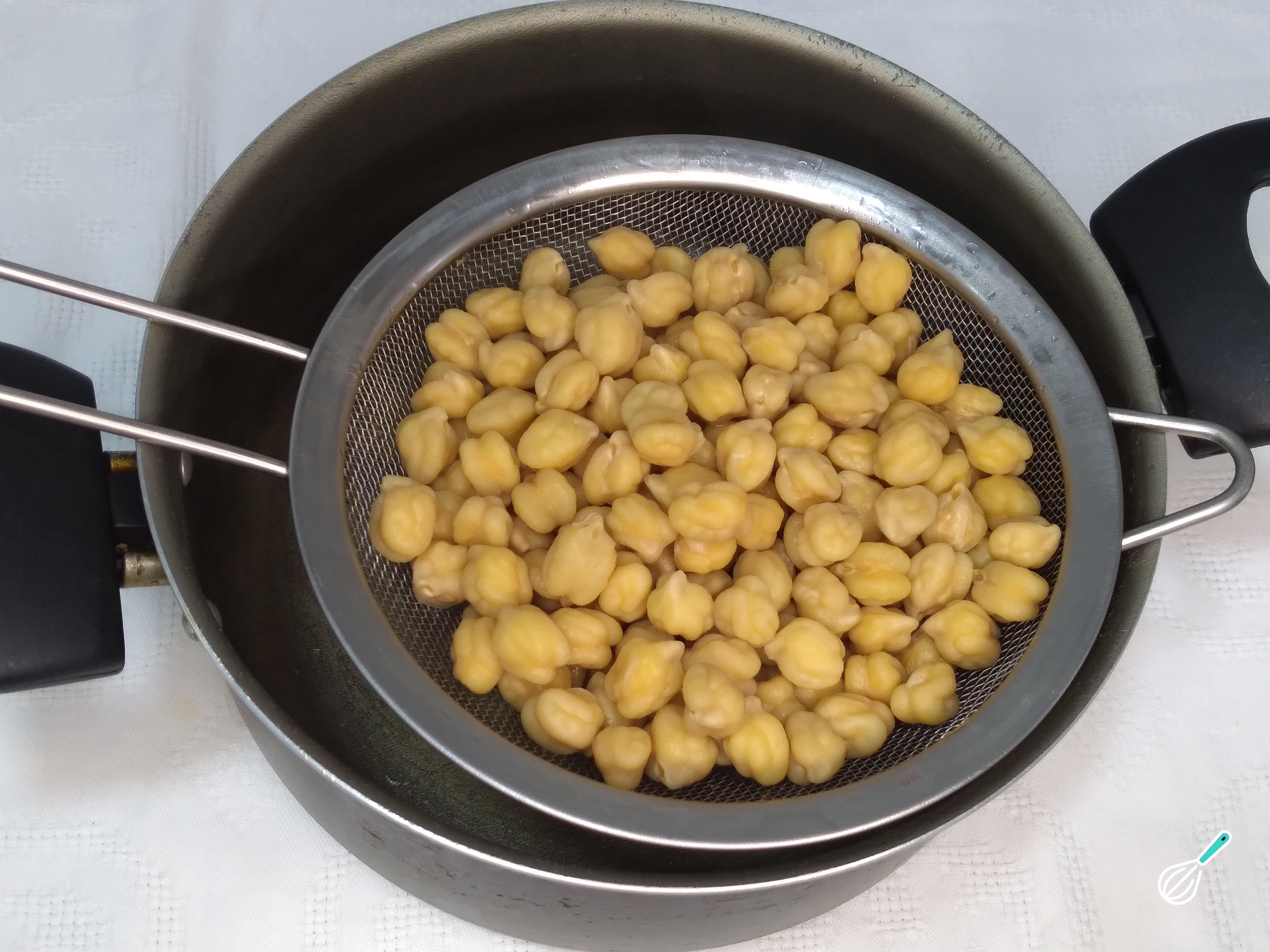 Feito isso, verifique o grão de bico. Quando estiver cozido ,retire do fogo e repita o processo com a peneira para drenar a água.