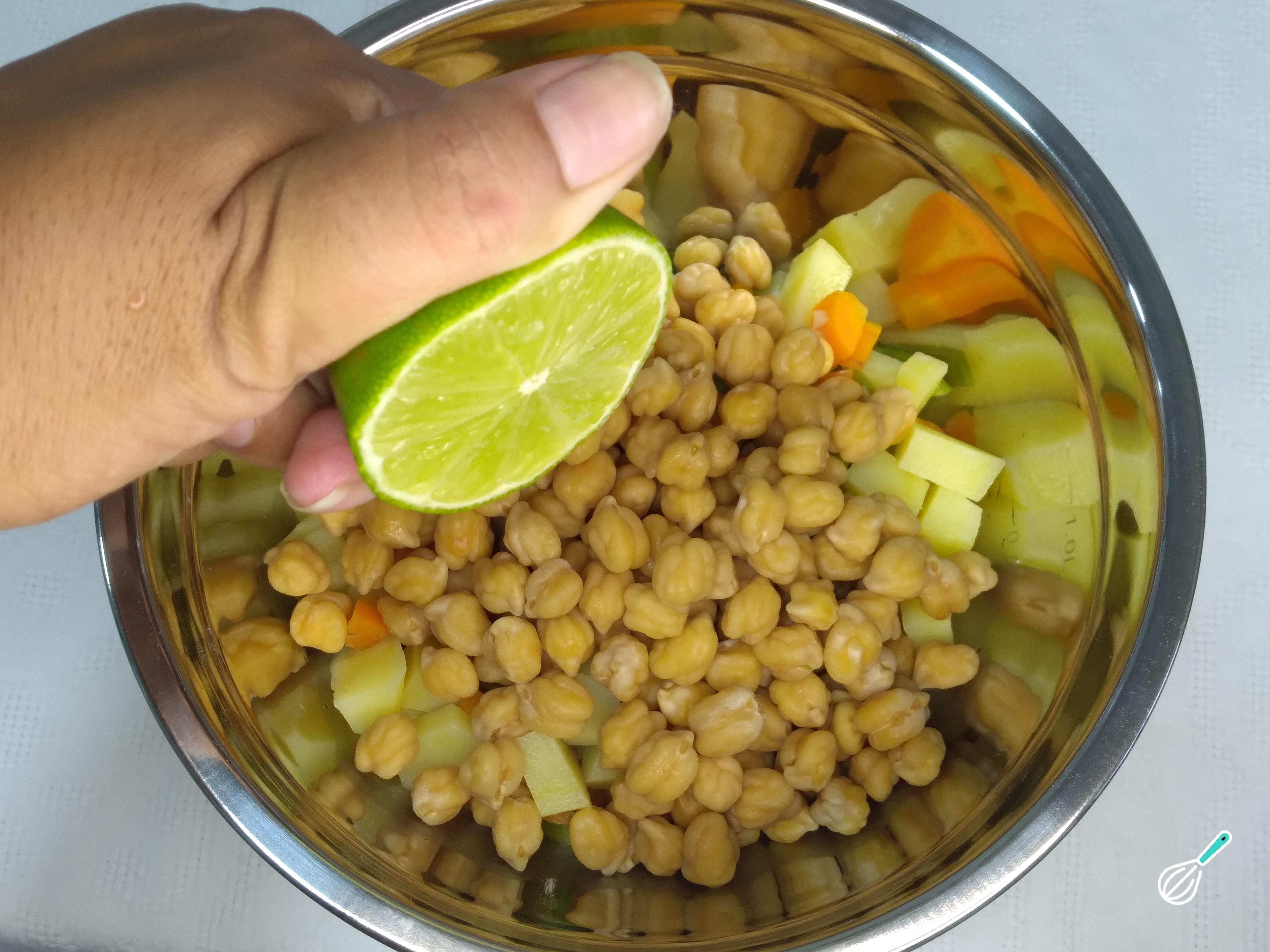 Retire o grão de bico e os legumes da geladeira e comece o preparo da salada. Coloque os legumes e o grão de bico em uma tigela e acrescente o suco de 1 limão. Acrescente também um pouco de sal e misture bem.
