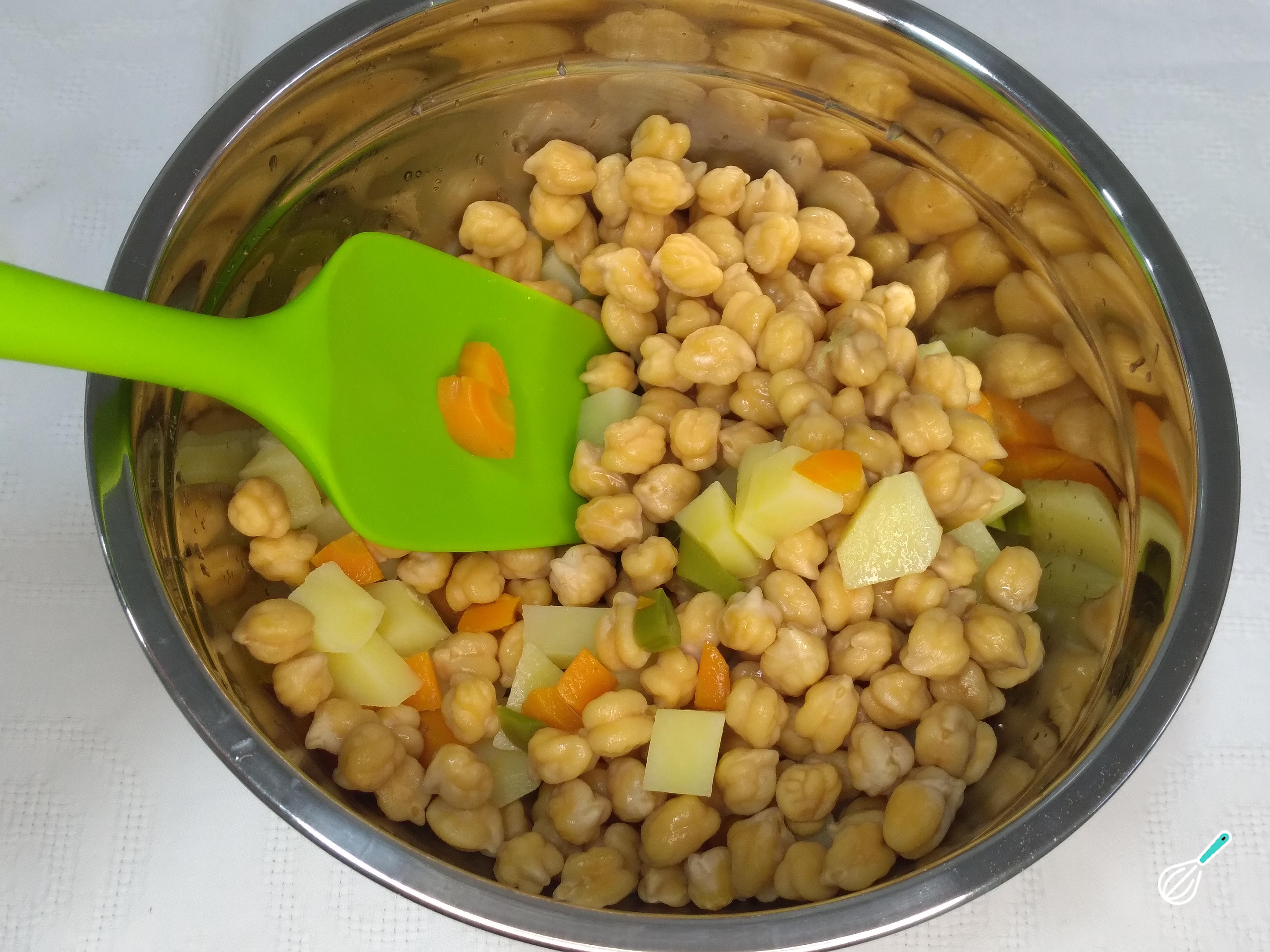 Misture tudo muito bem ,de preferência com uma colher de silicone, para manter os legumes inteiros.