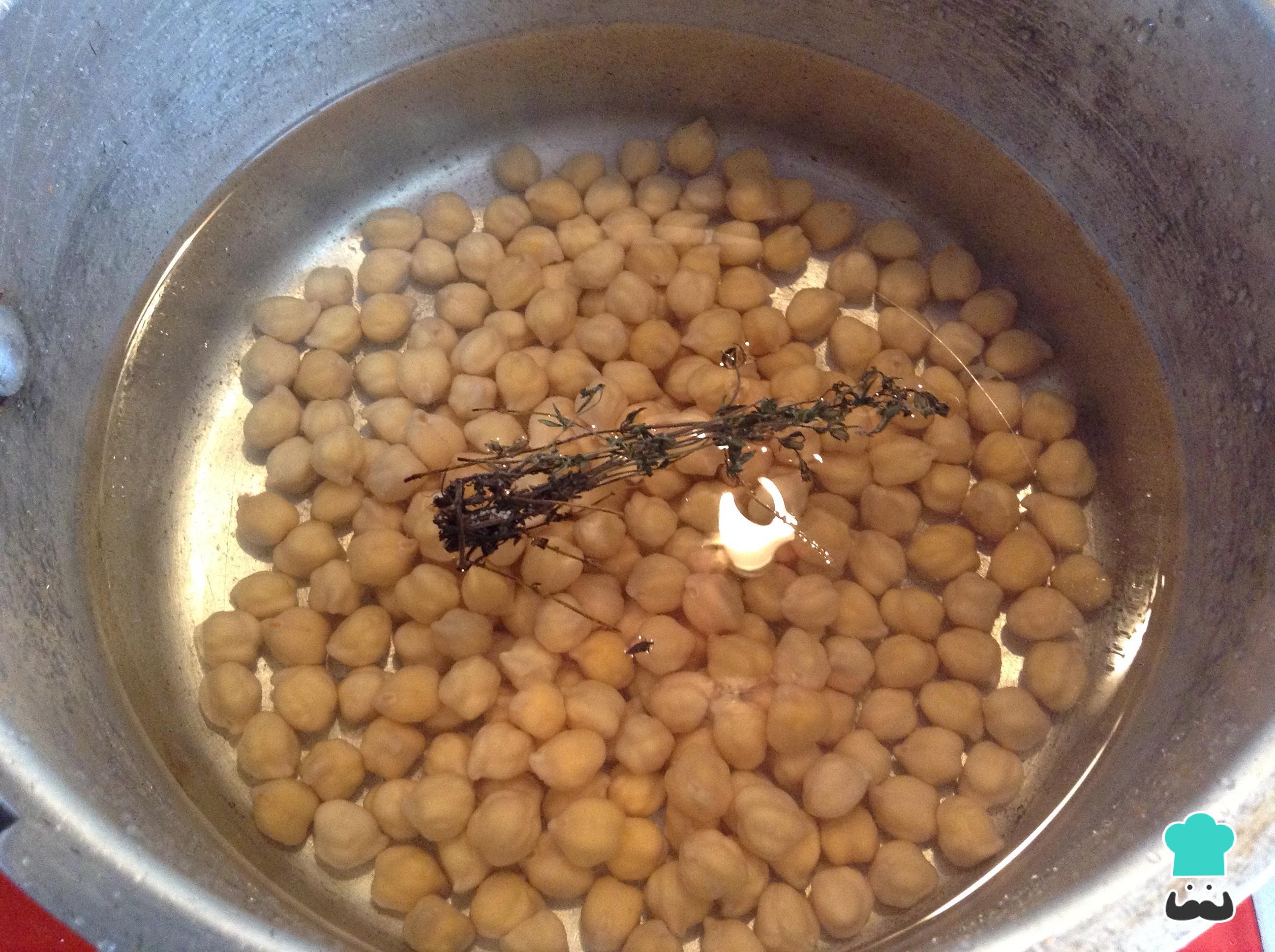 Depois de deixar o grão de bico de molho em água por 8-12 horas, confira como cozinhar grão de bico: escorra o grão e coloque-o numa panela de pressão com água até cobrir e temperos a gosto (eu usei sal e alguns ramos de tomilho). Tampe e deixe cozinhar por 20-25 minutos depois de pegar pressão.