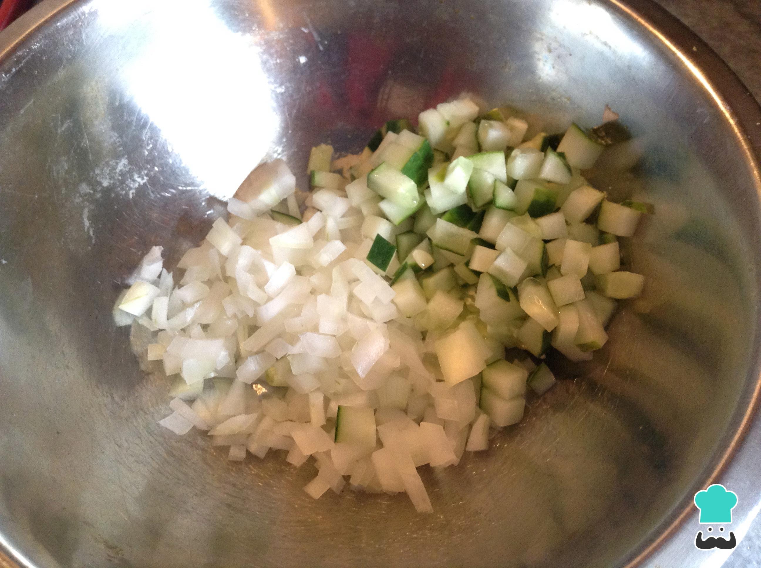 Enquanto o grão de bico coze, continue preparando esta salada de grão de bico com tomate: pique finamente o pepino e a cebola e coloque estes dois ingredientes numa tigela.