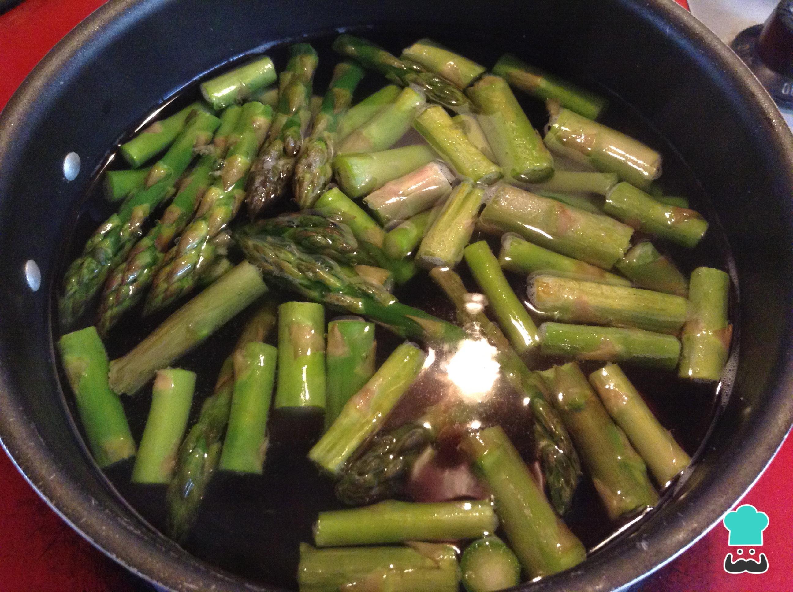 Numa panela em fogo médio com água fervendo e sal escalde os aspargos partidos em pedaços. Para isso bastam 10 minutos, queremos que os aspargos fiquem ligeiramente durinhos. Depois escorra e adicione à tigela.