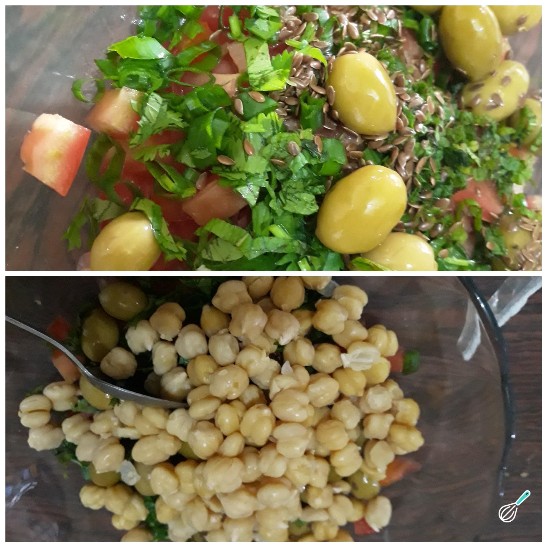 Pique o tomate sem as sementes e coloque num bowl. Junte o grão de bico e os demais ingredientes e misture bem.