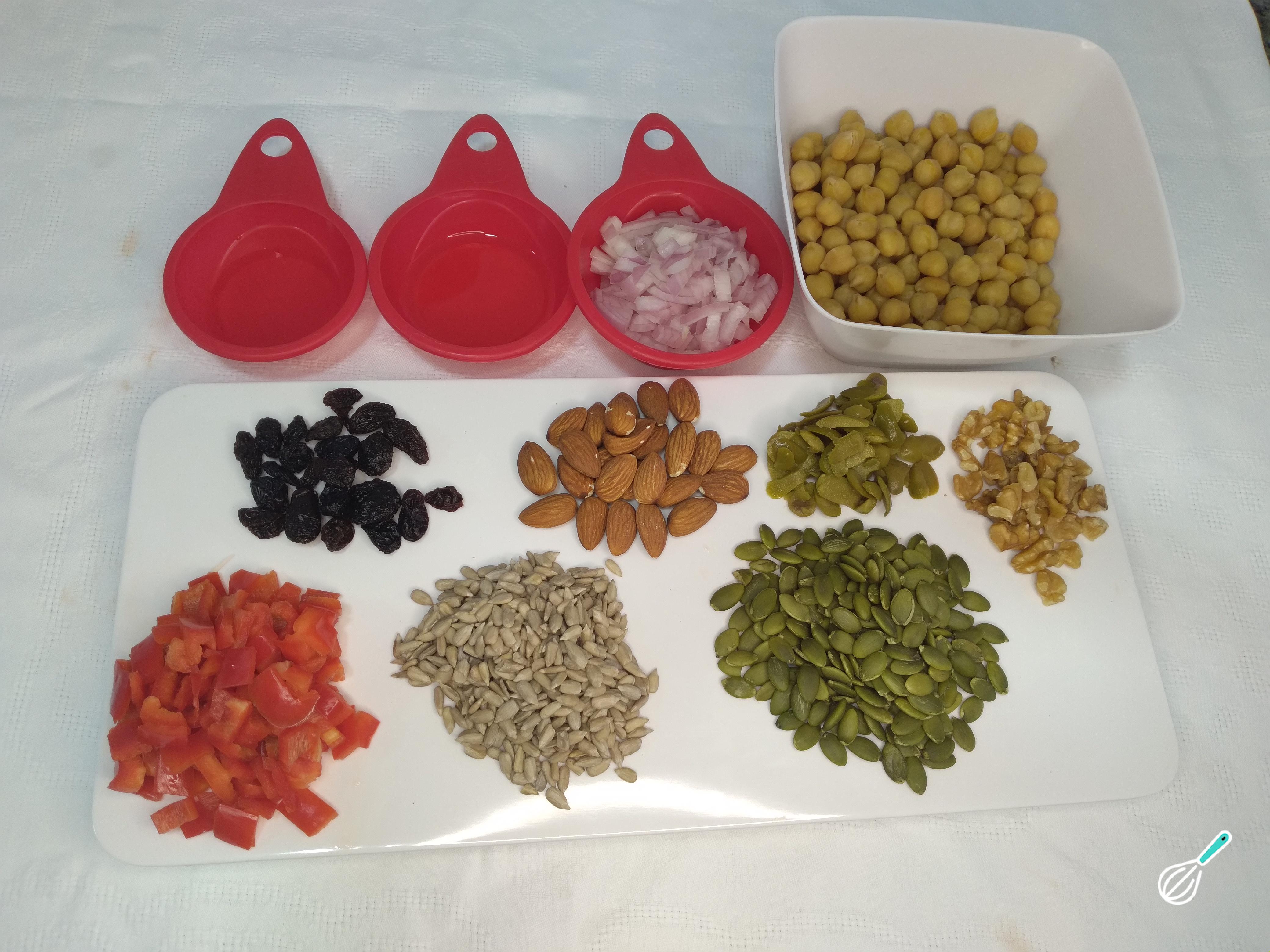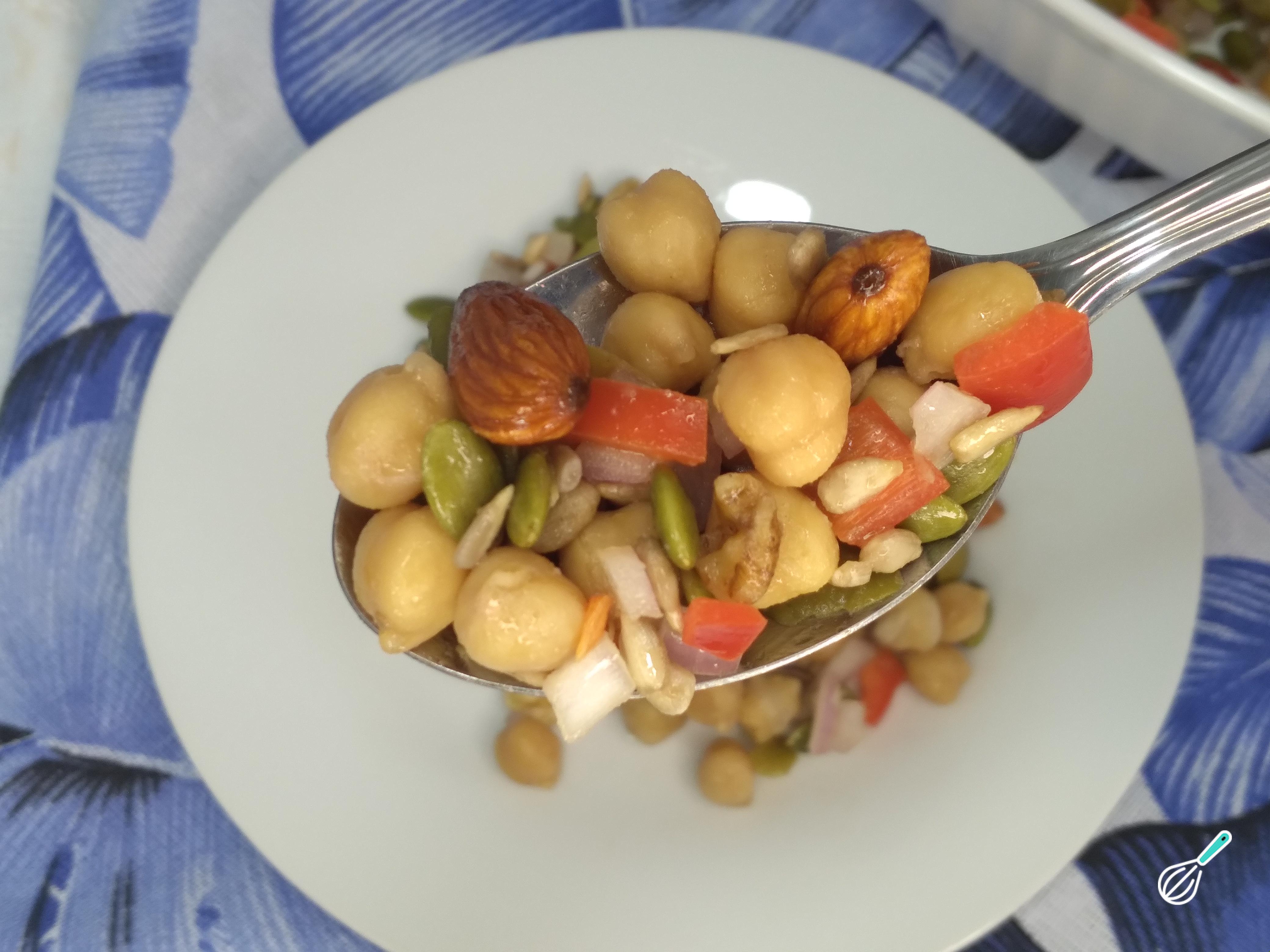 Hoje, aqui no TudoReceitas, estamos empolgados em apresentar uma salada de grãos. Esta é uma mistura deliciosa de grão de bico, sementes de abóbora e girassol, passas, cebola e pimentão vermelho, criando uma verdadeira explosão de sabores.