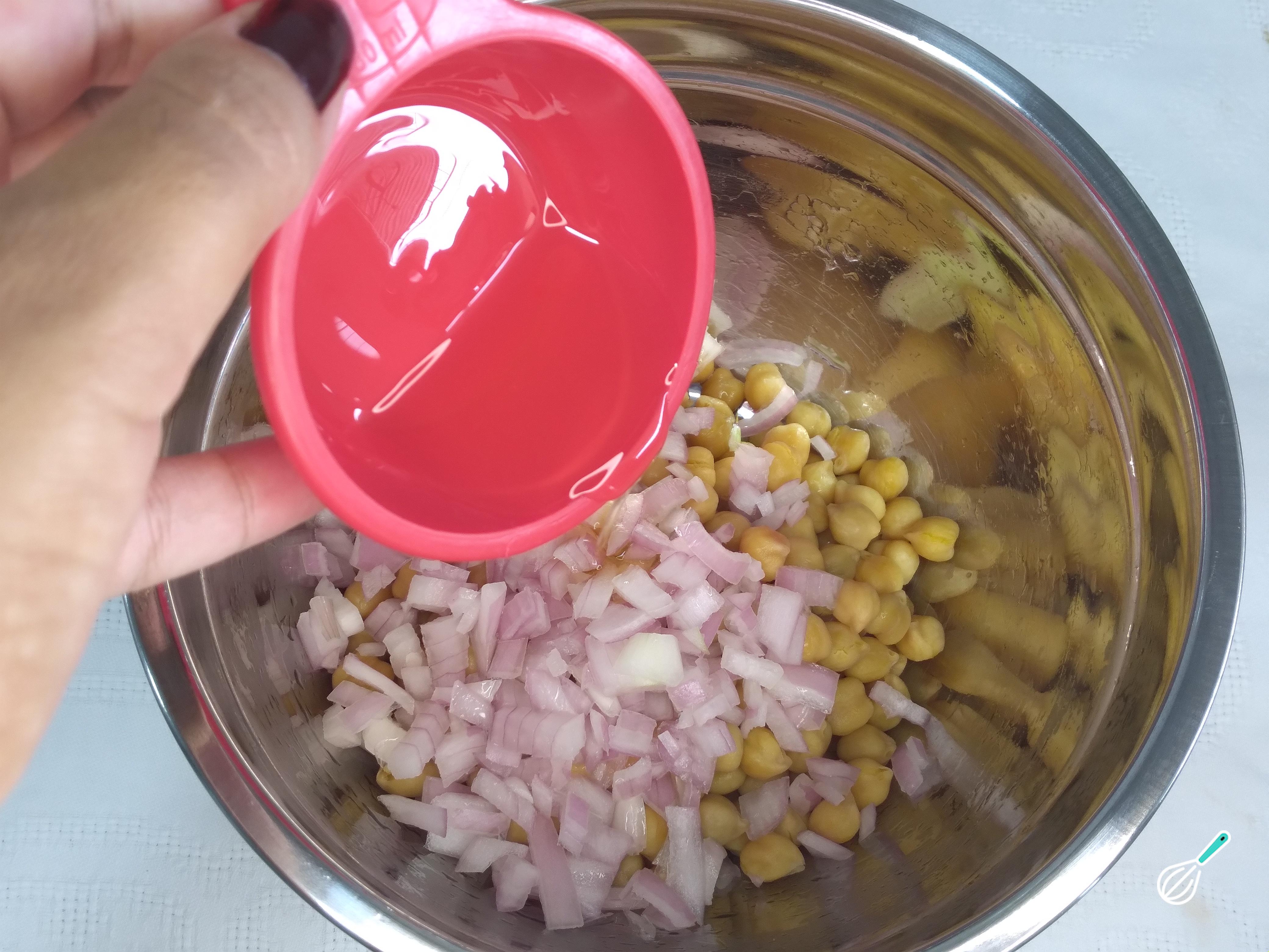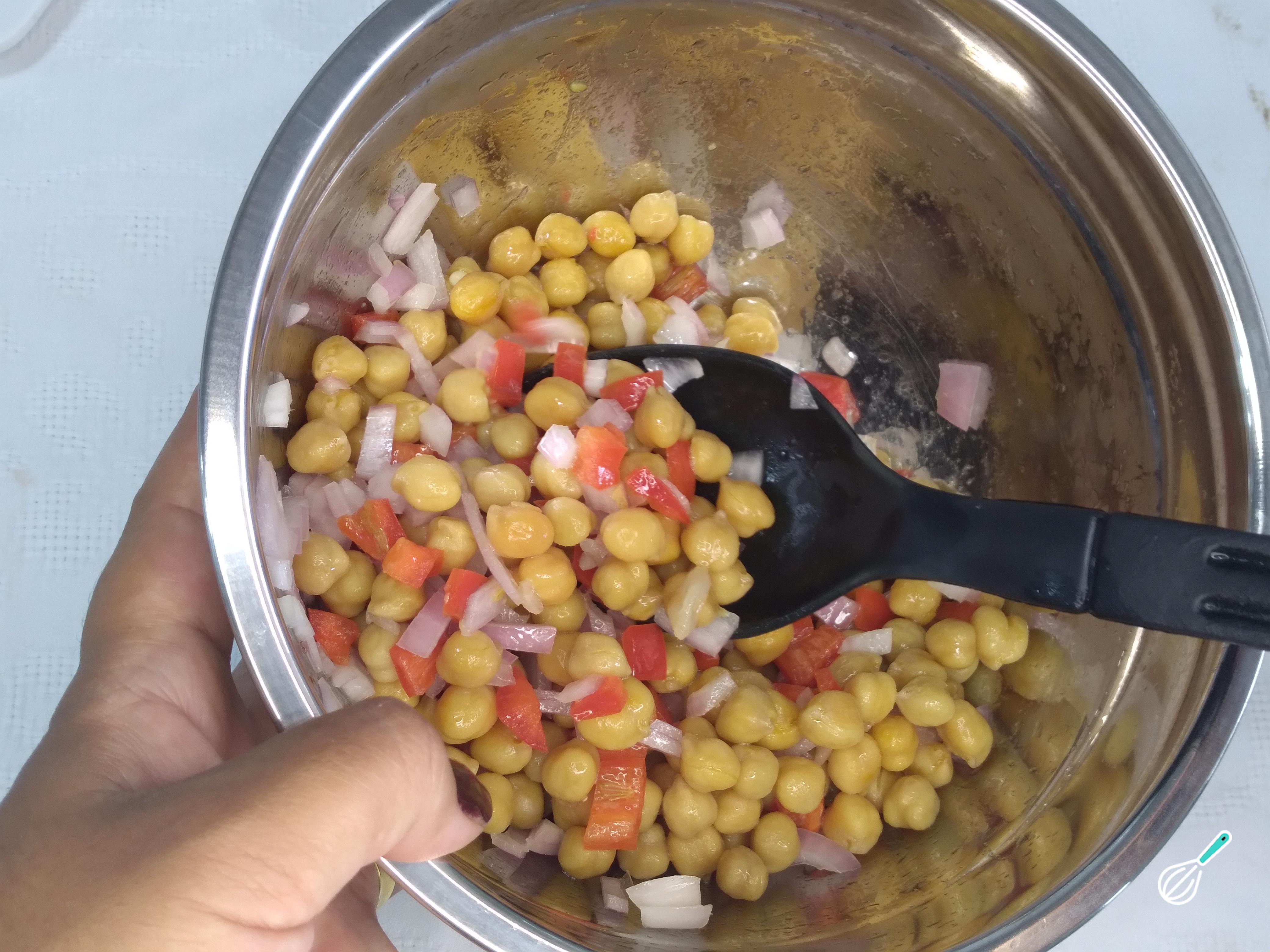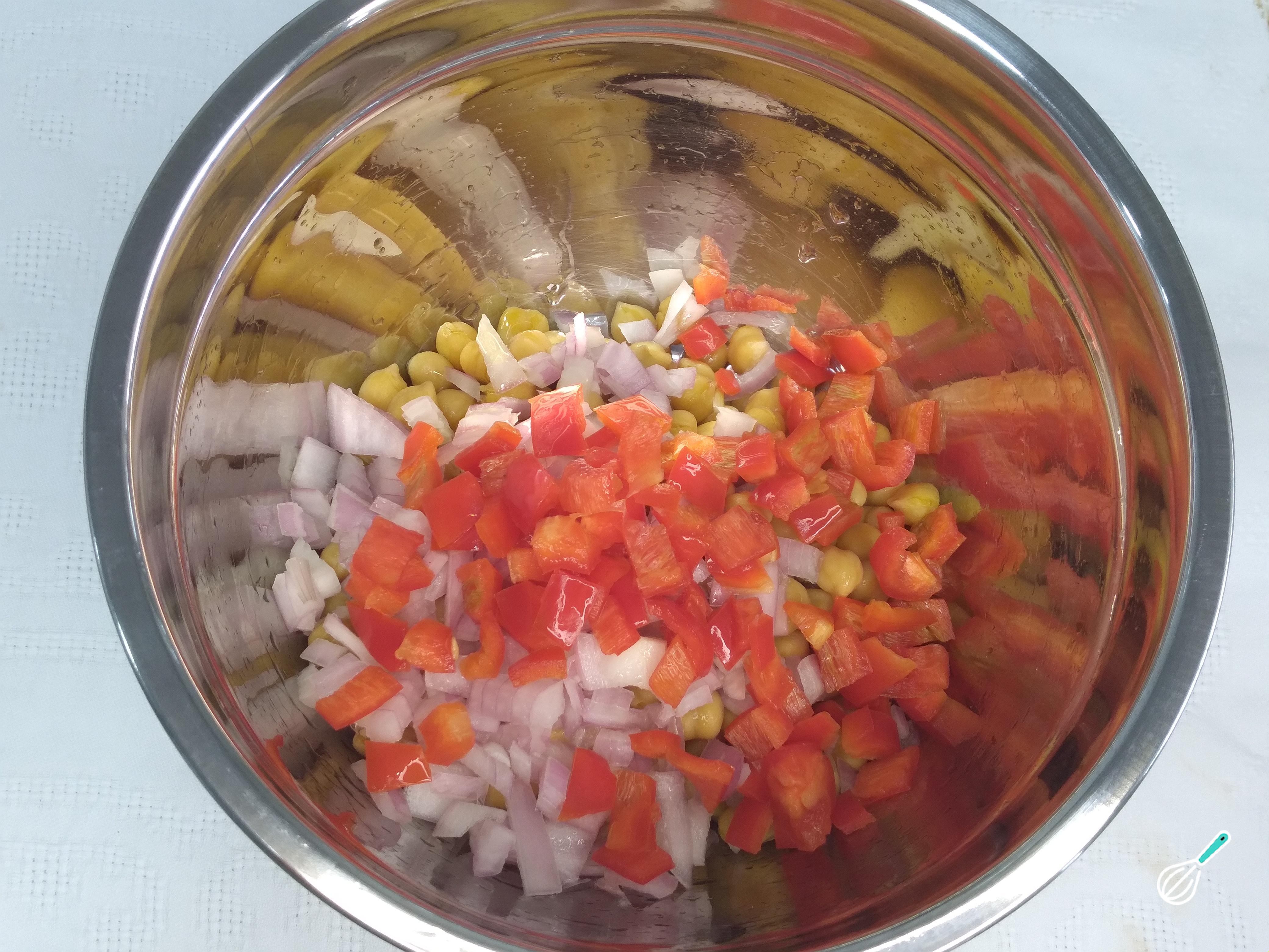 Em um bowl ou tigela, coloque o grão de bico, a cebola e o vinagre. Meus bem para incorporar os sabores.