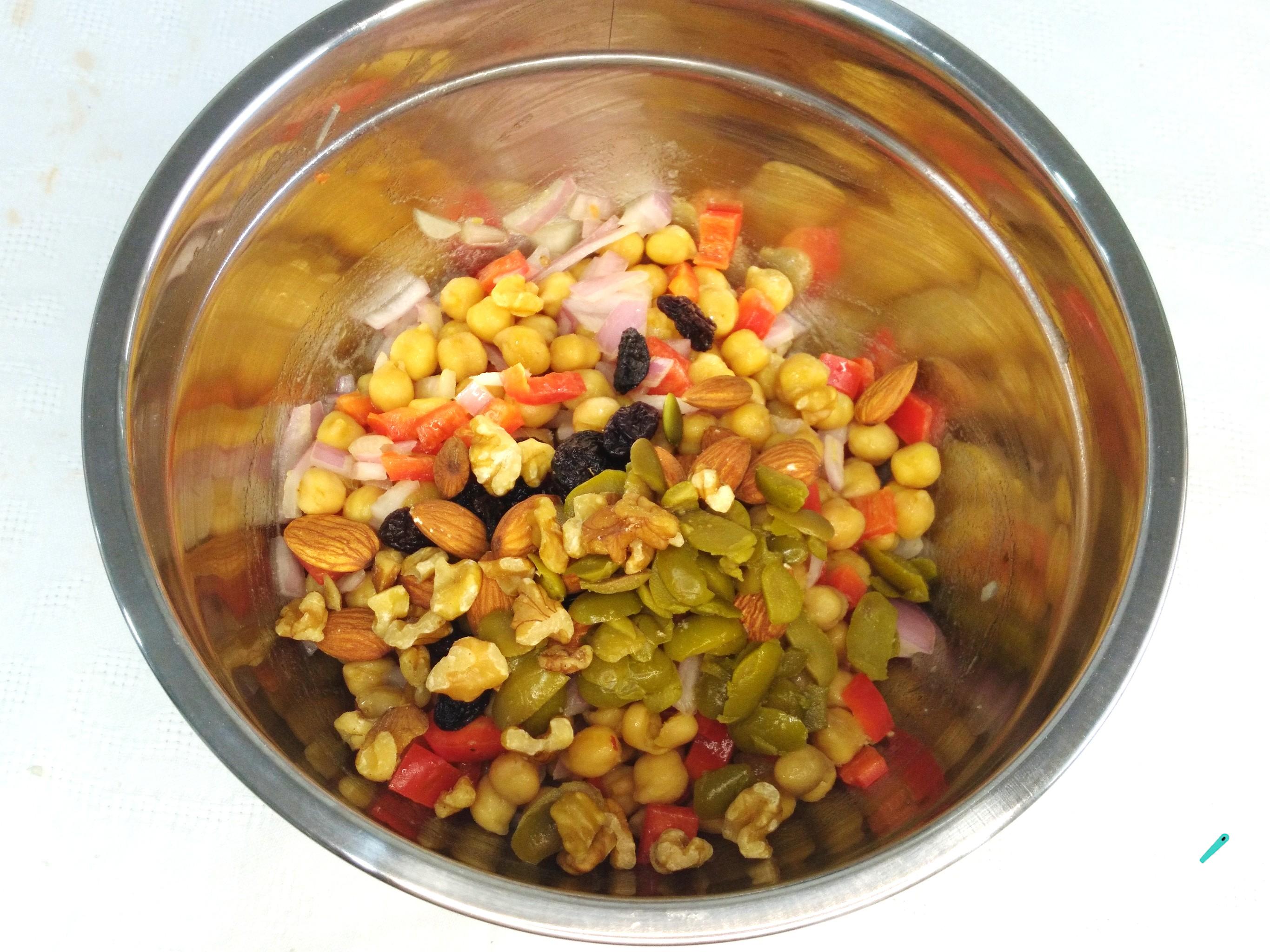 Dica: corte somente a cebola, o pimentão e as nozes. Deixe o restante dos grão inteiros.