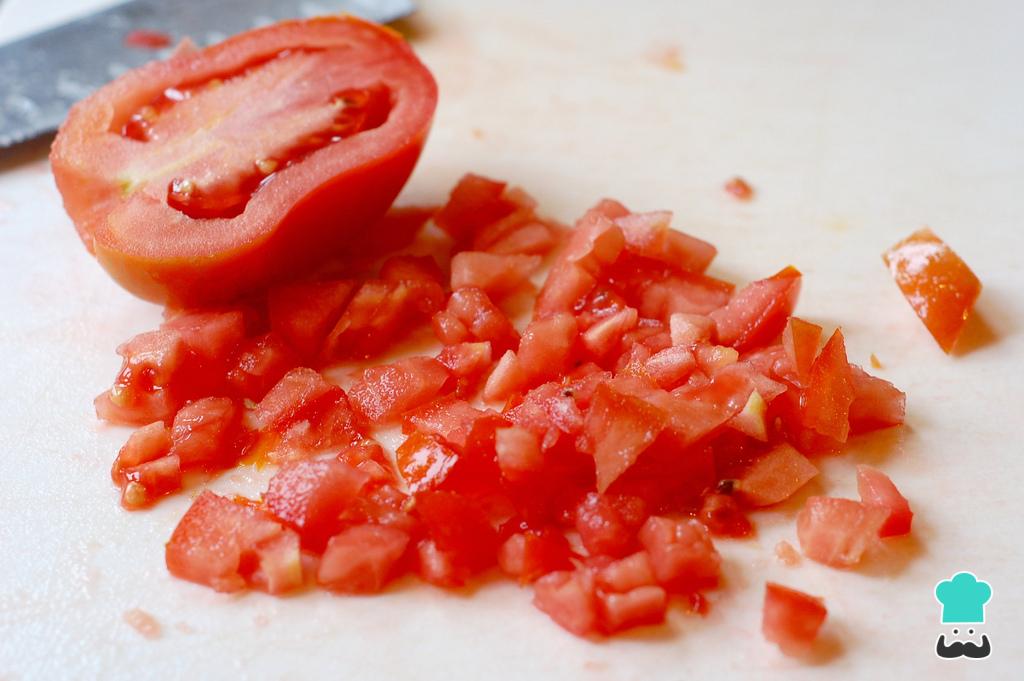 Para preparar essa salada de legumes com atum, comece por lavar bem e cortar o tomate em pedaços.