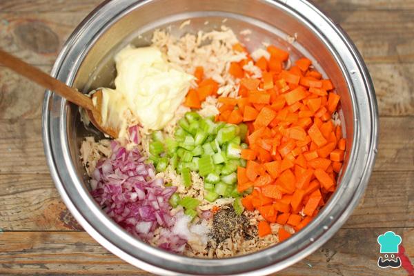 Dica: Você pode adicionar legumes a gosto como milho, ervilha, cenoura, batata, feijão fradinho e cebola.