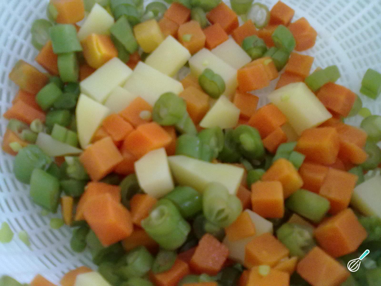 A salada de legumes cozidos com maionese é muito simples de preparar. Comece por misturar os legumes: a cenoura, a batata, a vagem, a cebola, o milho verde e a ervilha. Tempere com sal e pimenta do reino a gosto e junte a batata amassada.