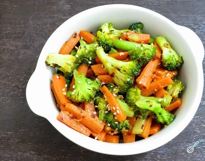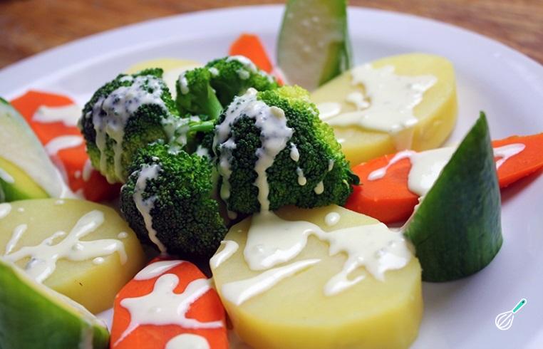Coloque os legumes na travessa do molho, misture e a sua salada de legumes no vapor está pronta a servir!