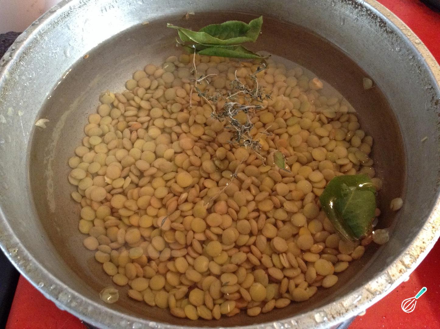 Escorra as lentilhas, coloque em uma panela e cubra com água filtrada. Acrescente também os temperos: sal, pimenta do reino, louro e tomilho. Cozinhe as lentilhas em fogo médio por 20 minutos, ou até que estejam macias.