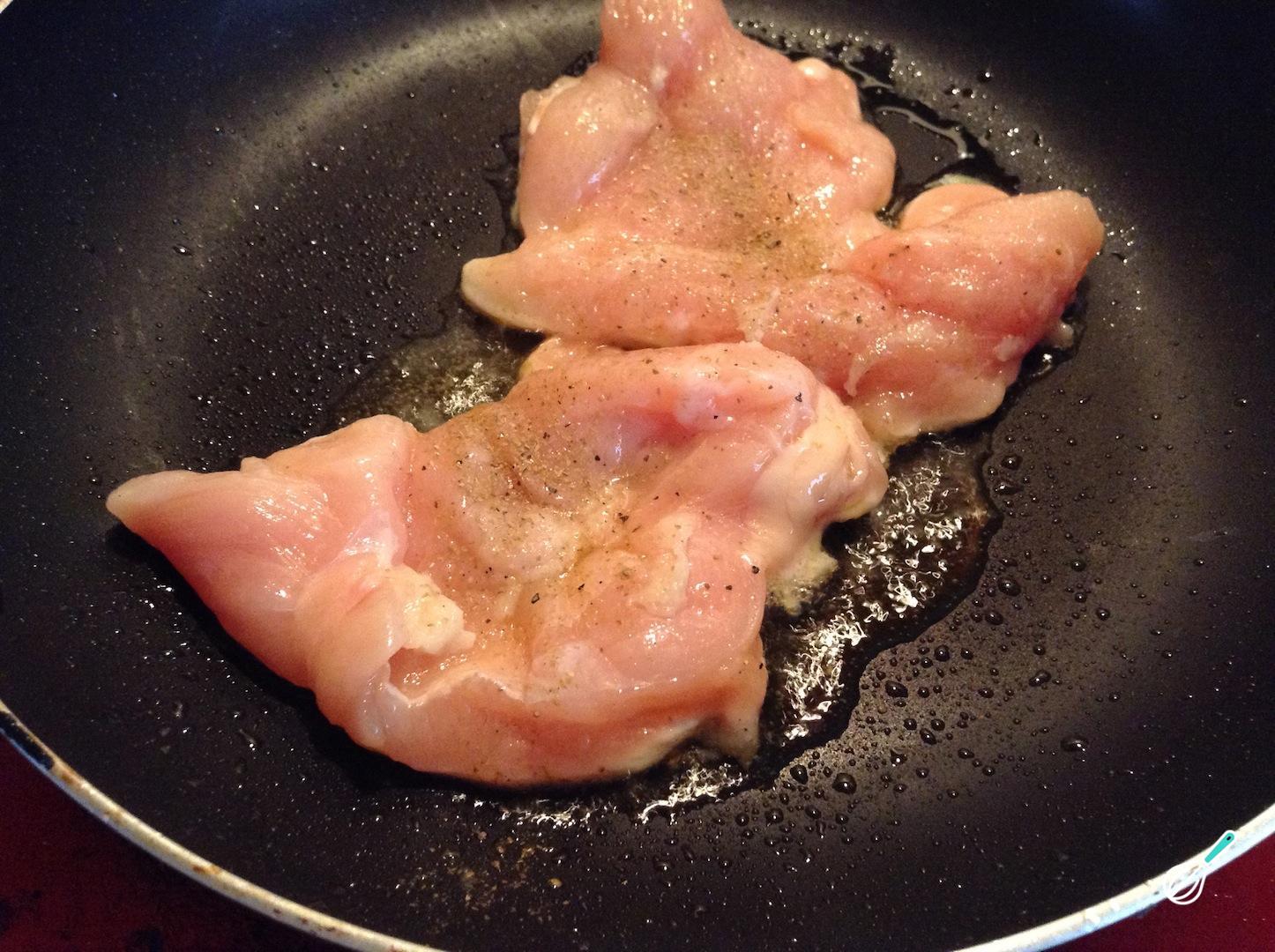 Enquanto isso, leve uma frigideira ao fogo médio com o óleo, e cozinhe os filés de frango temperados com sal, pimenta e pasta de alho, até que estejam dourados. Retire e reserve.