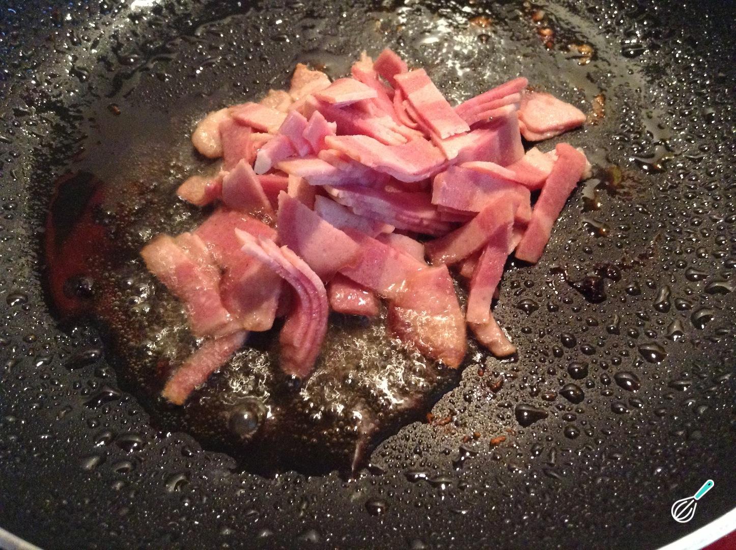 Na mesma frigideira, frite agora o bacon até ficar dourado e crocante. Com este ingrediente conseguiremos conferir crocância à salada de lentilhas com carne.