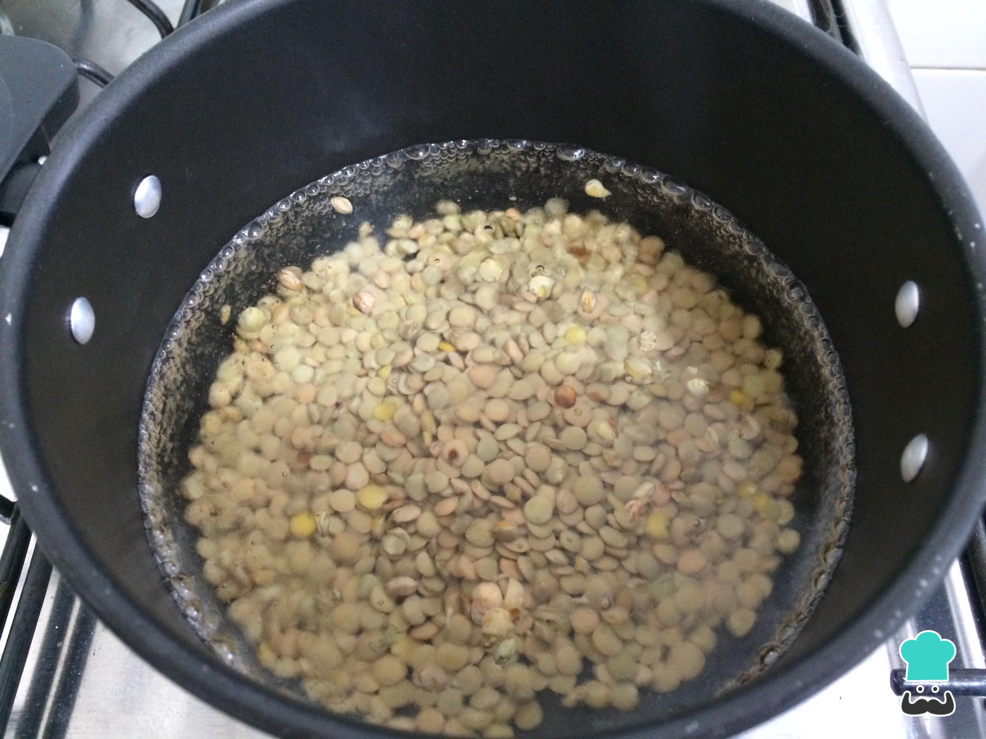 Leve ao fogo médio uma panela com água fervente e sal, cozinhe as lentilhas por 30 minutos, ou até que estejam macias. Escorra e reserve.