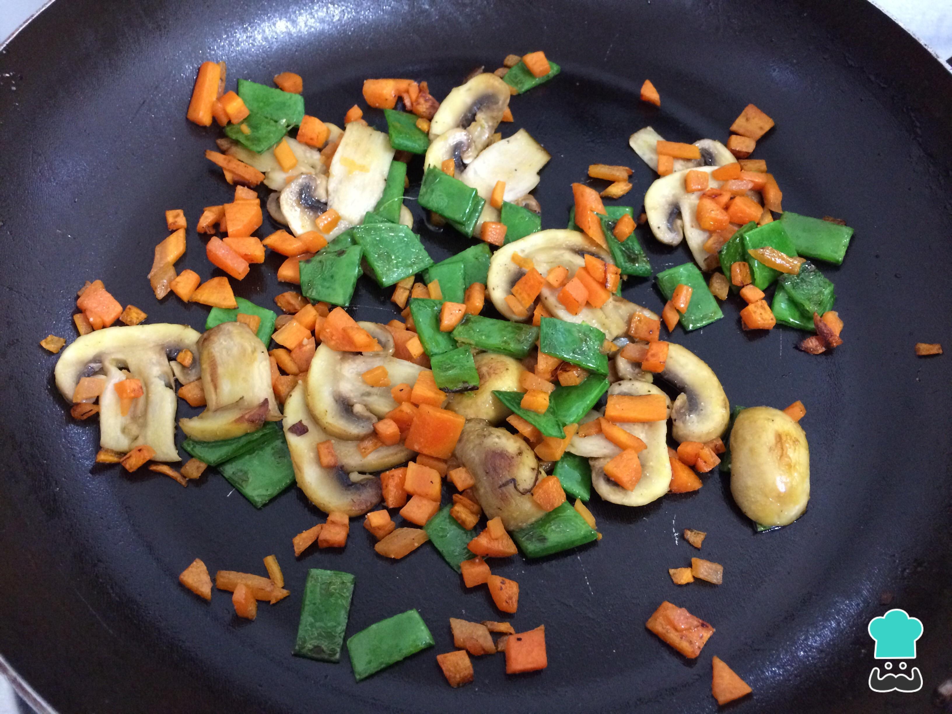Enquanto isso, leve ao fogo médio uma frigideira com o azeite e refogue a cenoura picadinha, a ervilha cortada em pedaços pequenos e os cogumelos fatiados, por 2-3 minutos. Tempere com sal e pimenta.