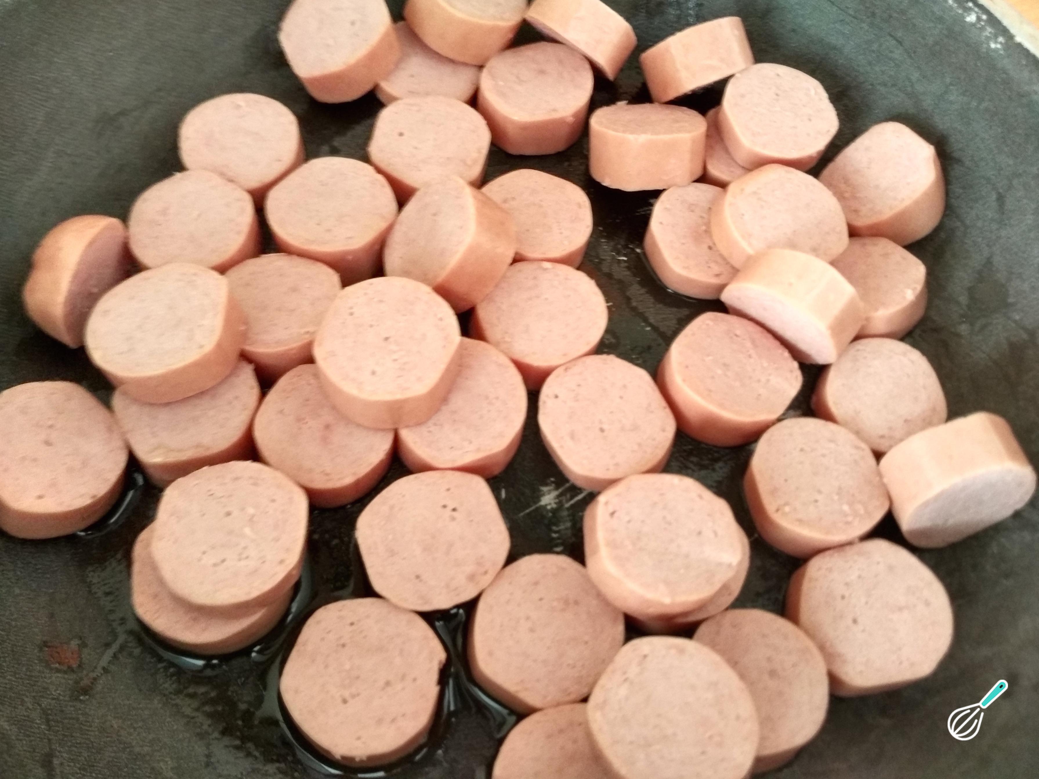 Corte as salsichas em rodelas de 1 cm e refogue em uma panela com um pouco de azeite de oliva até dourarem.