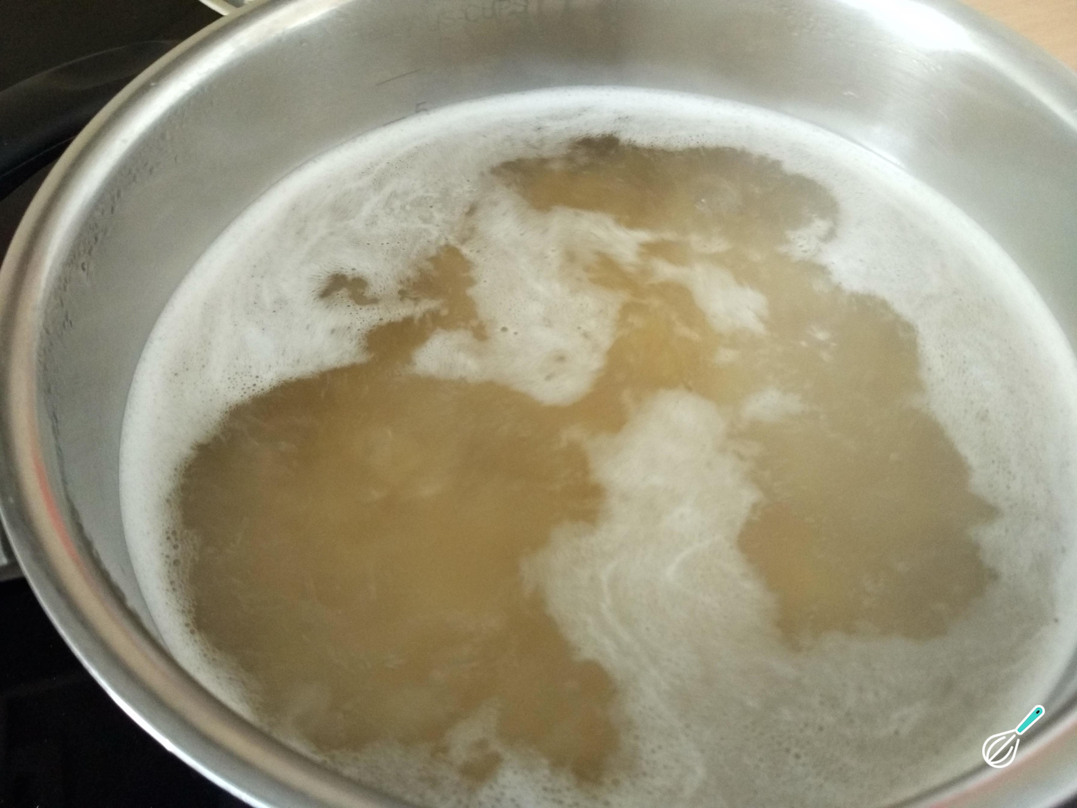 Enquanto isso, cozinhe o macarrão em bastante água fervente com um pouco de sal. Depois de cozido, passe o macarrão por água fria e deixe escorrer.