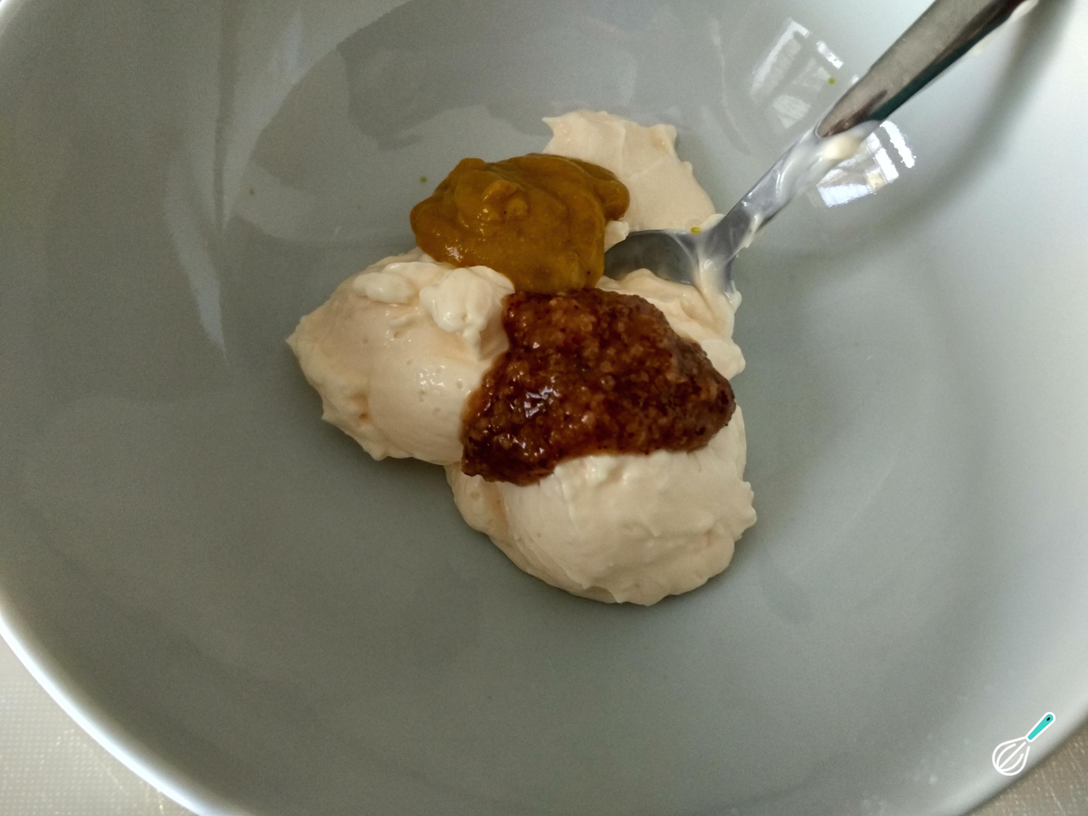 Para preparar o molho desta salada alemã, misture a maionese, a mostarda doce e a mostarda em grãos. Misture bem com um garfo.