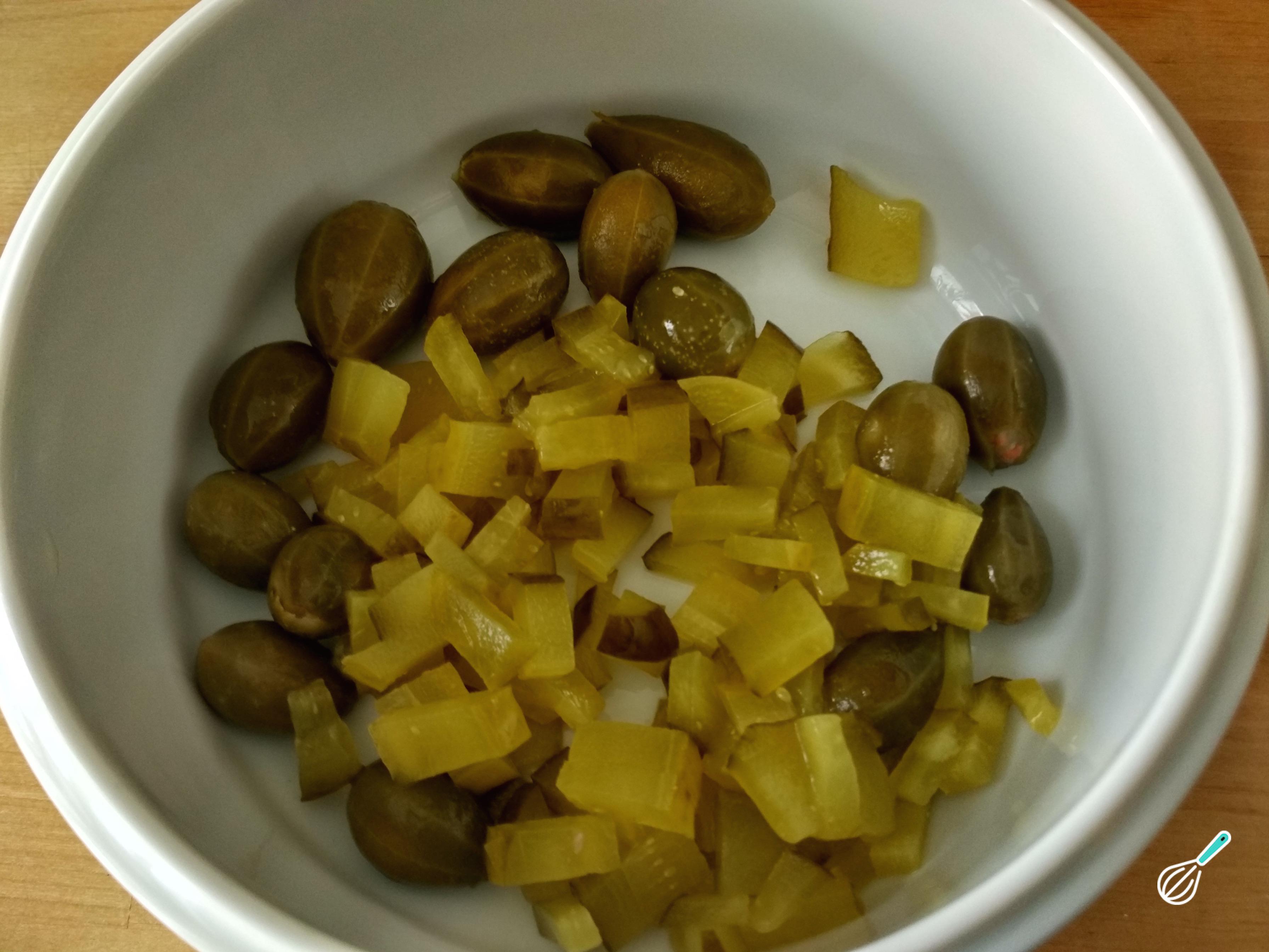 Em uma saladeira, misture as alcaparras e o pepino em conserva picado. Lembre-se que é necessário remover o rabo das alcaparras se forem grandes.