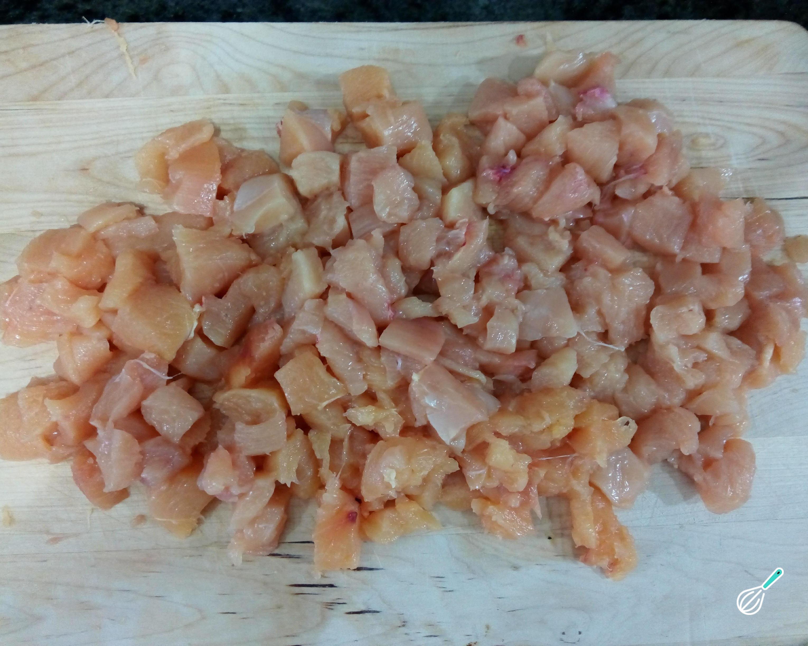 Enquanto o macarrão está no fogo pique os peitos de frango em cubinhos e tempere com sal e pimenta a gosto.Nesta receita fazemos o frango na frigideira em vez de cozinha na panela, assim ele fica pronto mais rápido e fica mais saboroso!