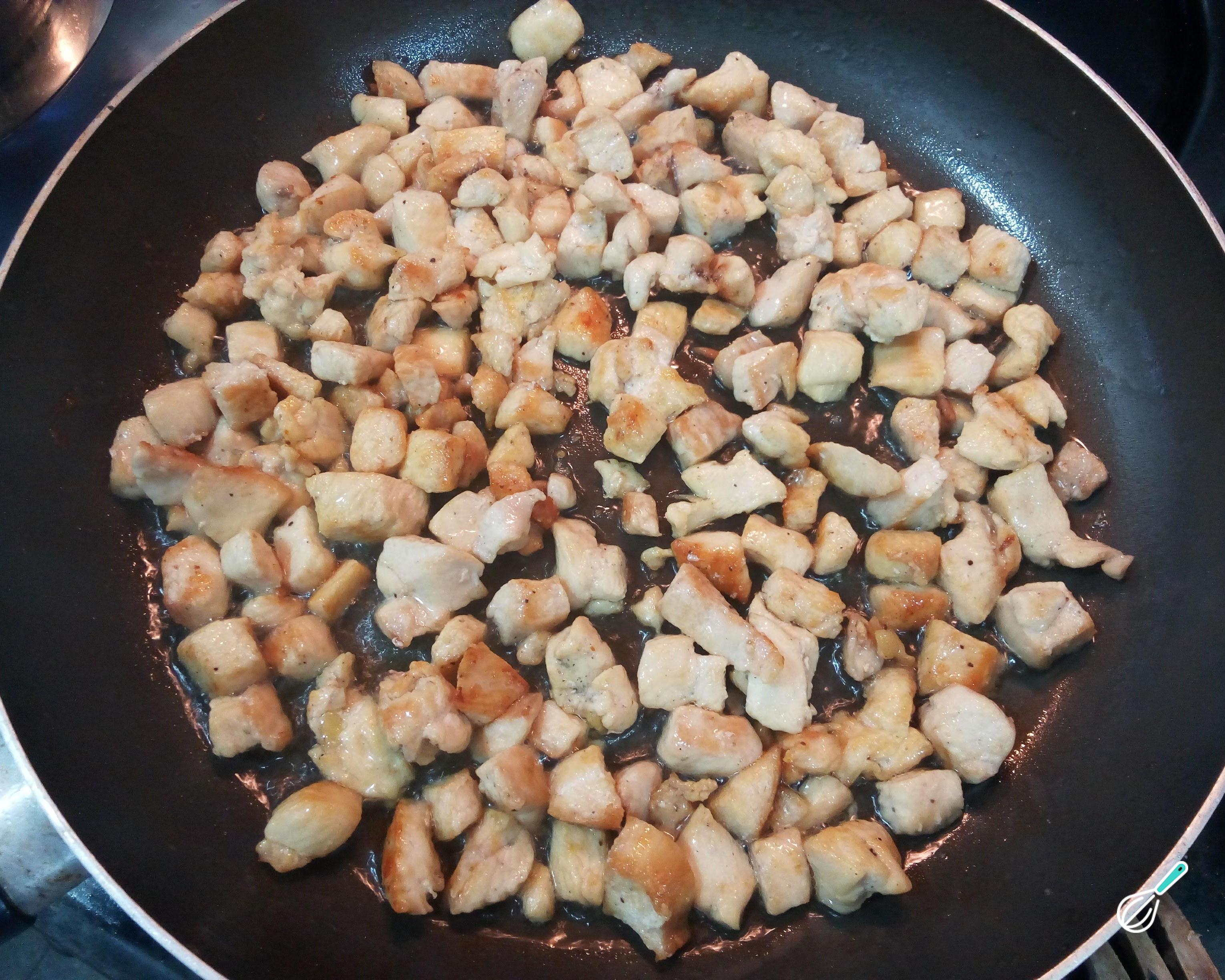 Leve ao fogo uma frigideira antiaderente com um fio de azeite e, quando estiver quente, coloque o frango. Deixe cozinhar por 5-10 minutos, mexendo de vez em quando, até ficar douradinho de todos os lados. Desligue o fogo e reserve.