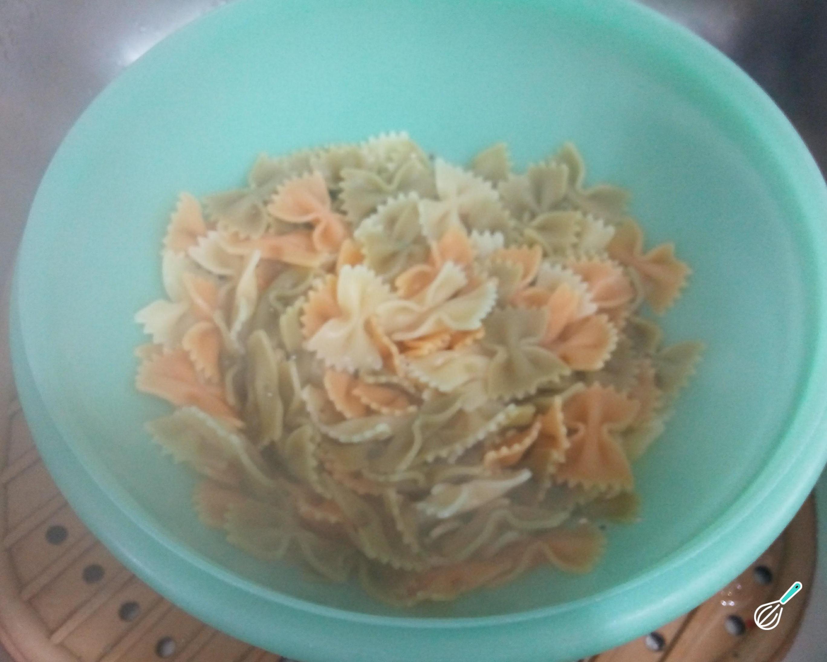 Quando o macarrão estiver al dente (nem muito macio nem muito cru) escorra a água e coloque num recipiente. Regue com um fio de azeite e misture, esse é um truque para o macarrão não grudar. Deixe esfriar.