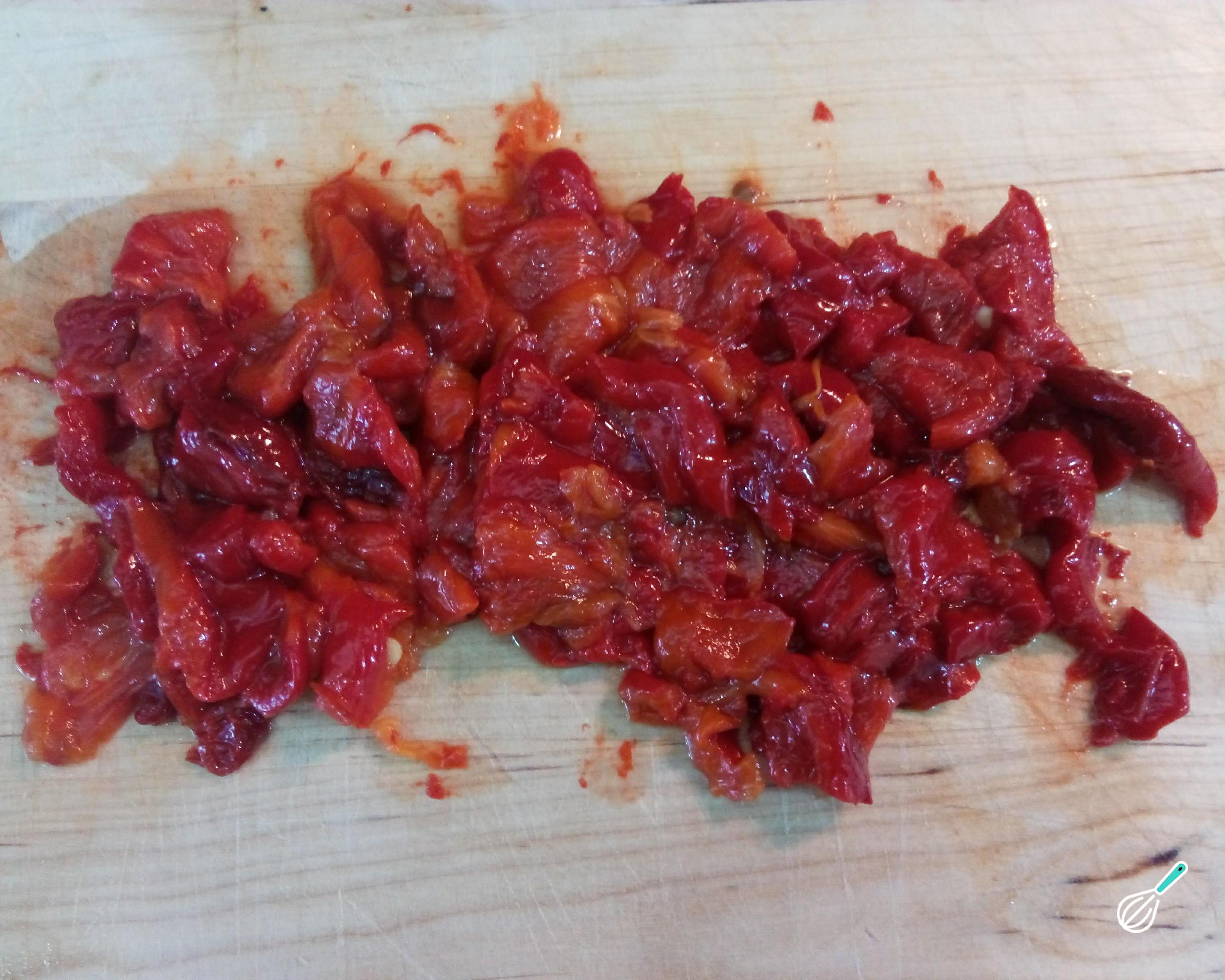 Por fim pique o pimentão assado ou o pimentão defumado. Recomendo usar pimentão deste jeito porque ele fica mais saboroso e com uma textura que combina melhor com esta salada fria de macarrão.
