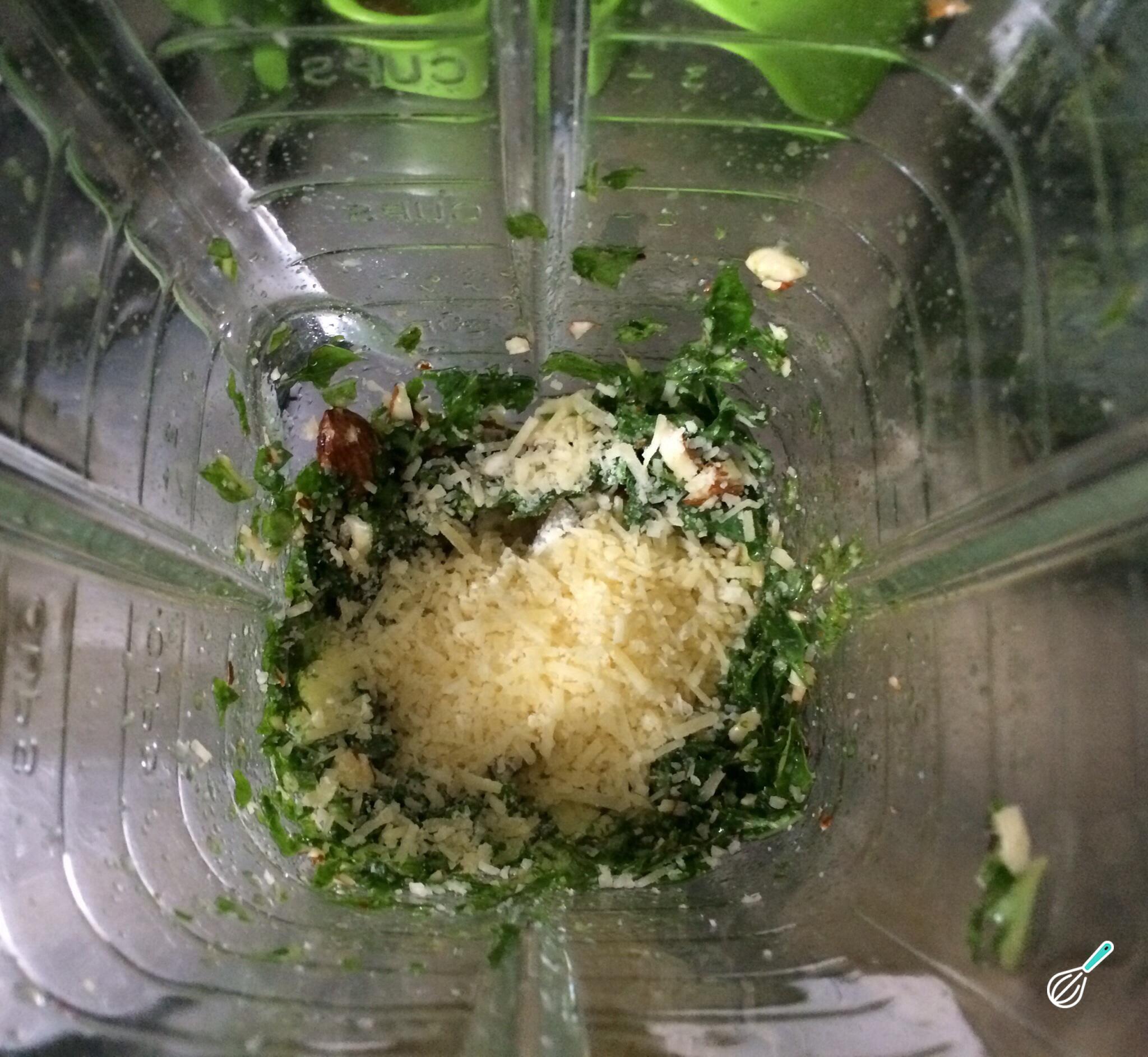 Acrescente o queijo parmesão, mais duas colheres de azeite, sal e pimenta. Bata novamente até obter uma pasta mais ou menos homogênea, que será o tempero desta salada de macarrão fit com brócolis e pesto.