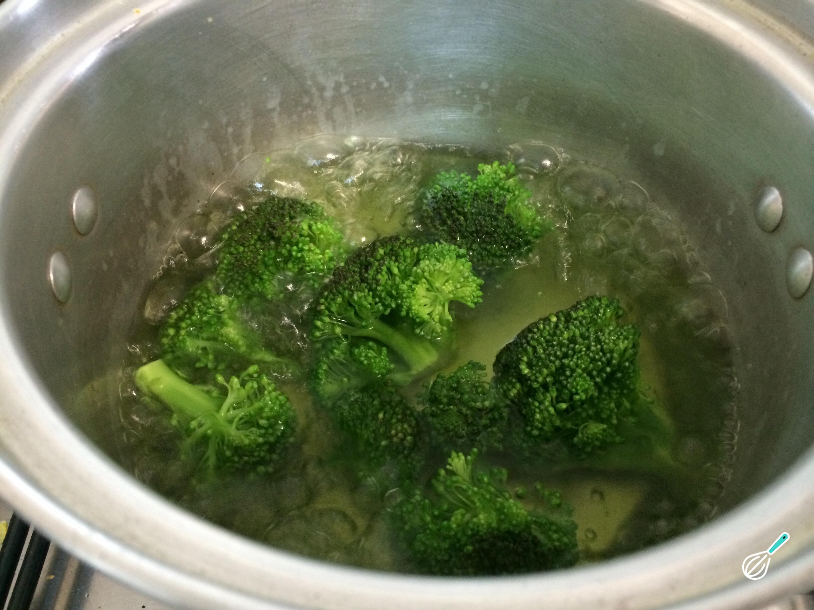 Cozinhe o brócolis por 10 minutos em água fervente com sal. Após esse tempo, escorra e deixe esfriar. Como alternativa você pode cozinhar o brócolis a vapor.