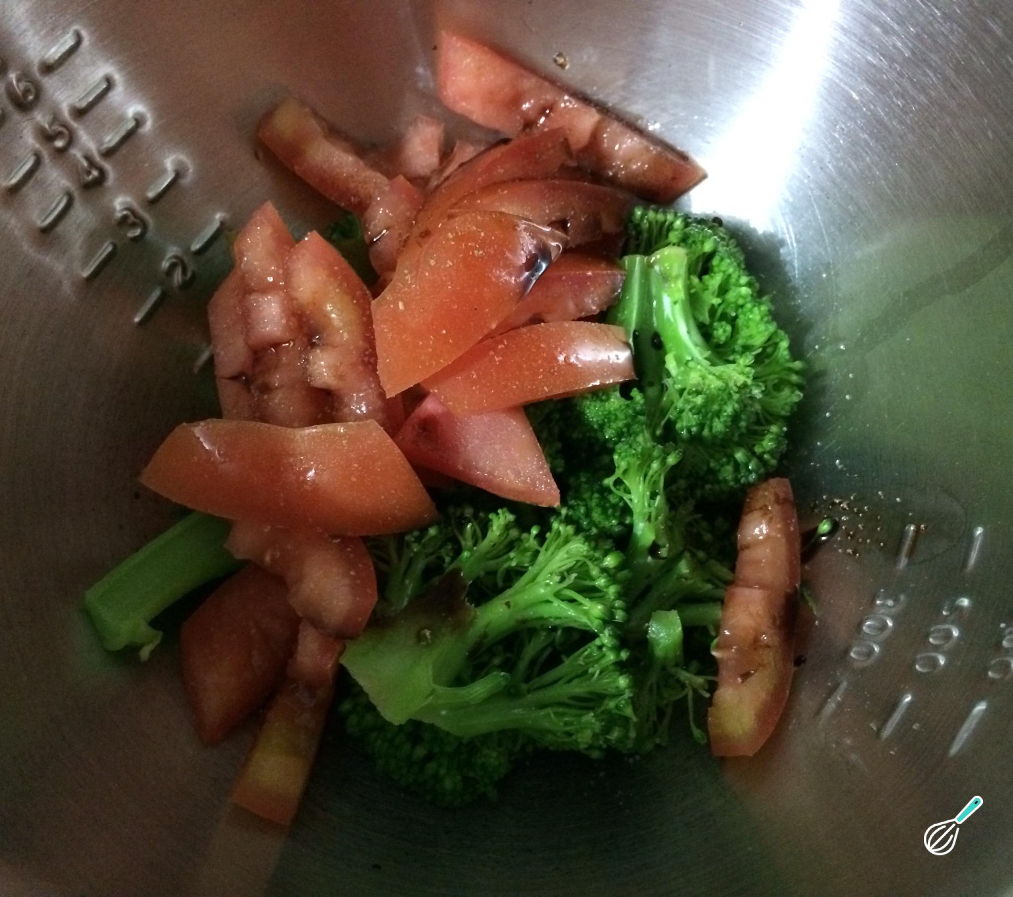 Quando o brócolis estiver cozinhado, coloque-o em um recipiente junto com o tomate cortado sem sementes, vinagre balsâmico, sal e pimenta.