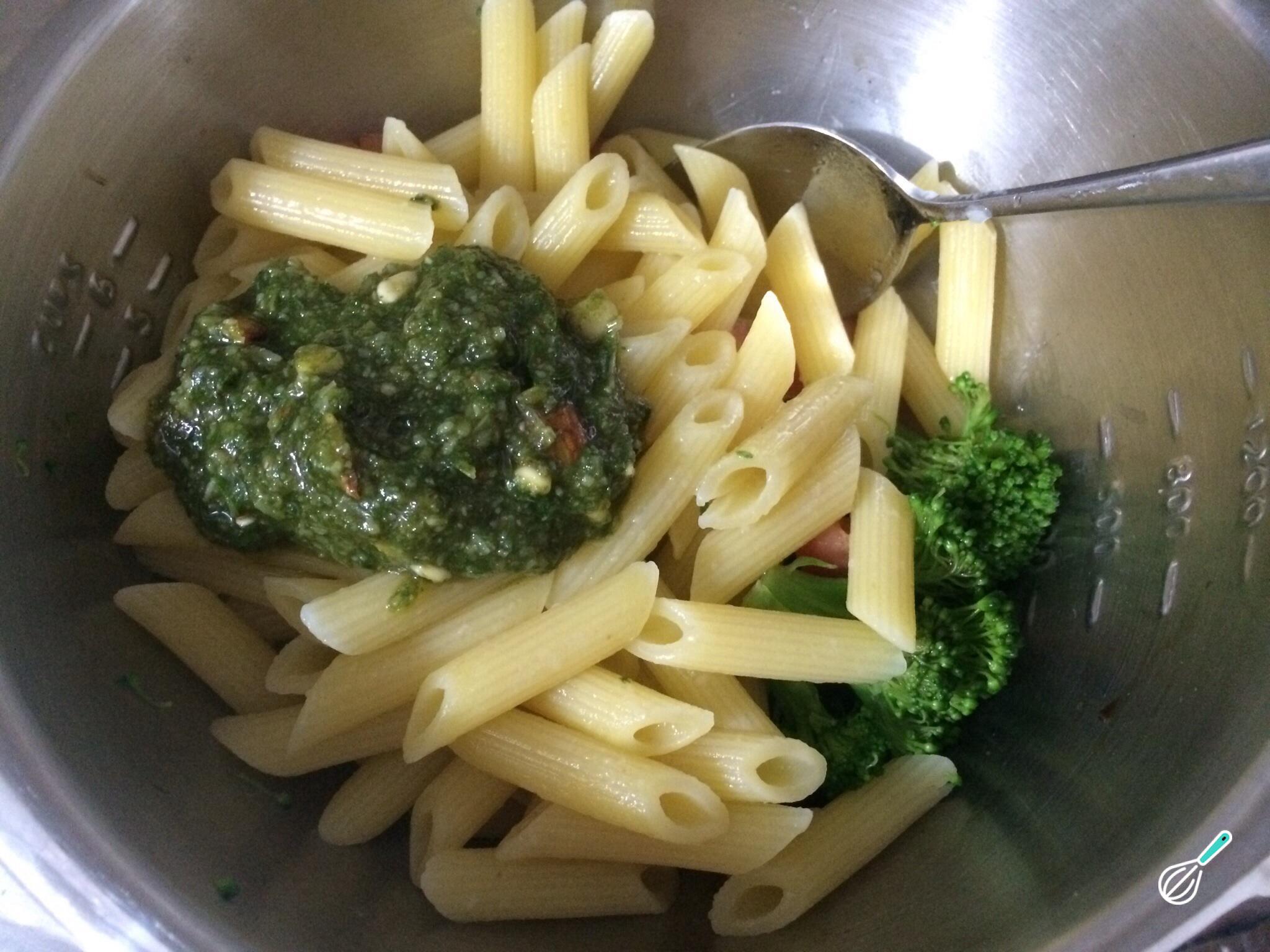 Acrescente o macarrão e o pesto, e misture bem todos os ingredientes.