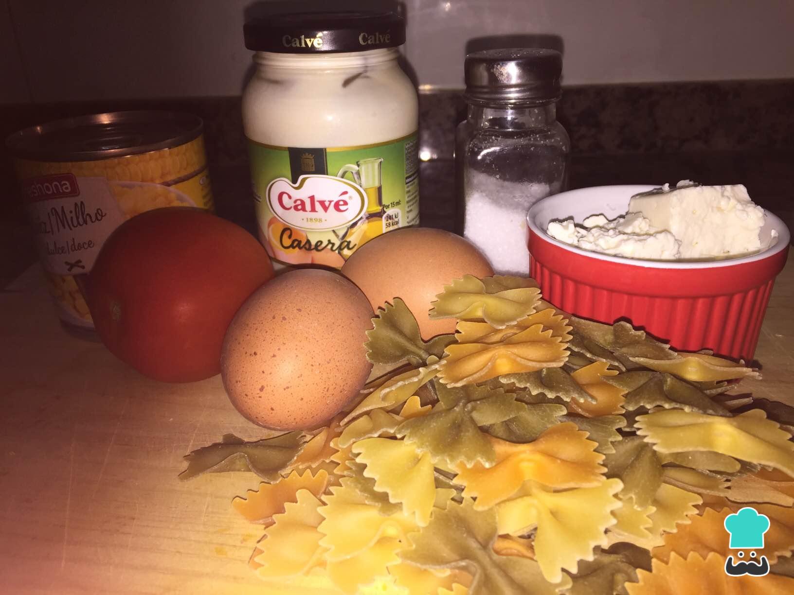 Comece esta receita de salada de macarrão gravata, por juntar todos os ingredientes necessários.