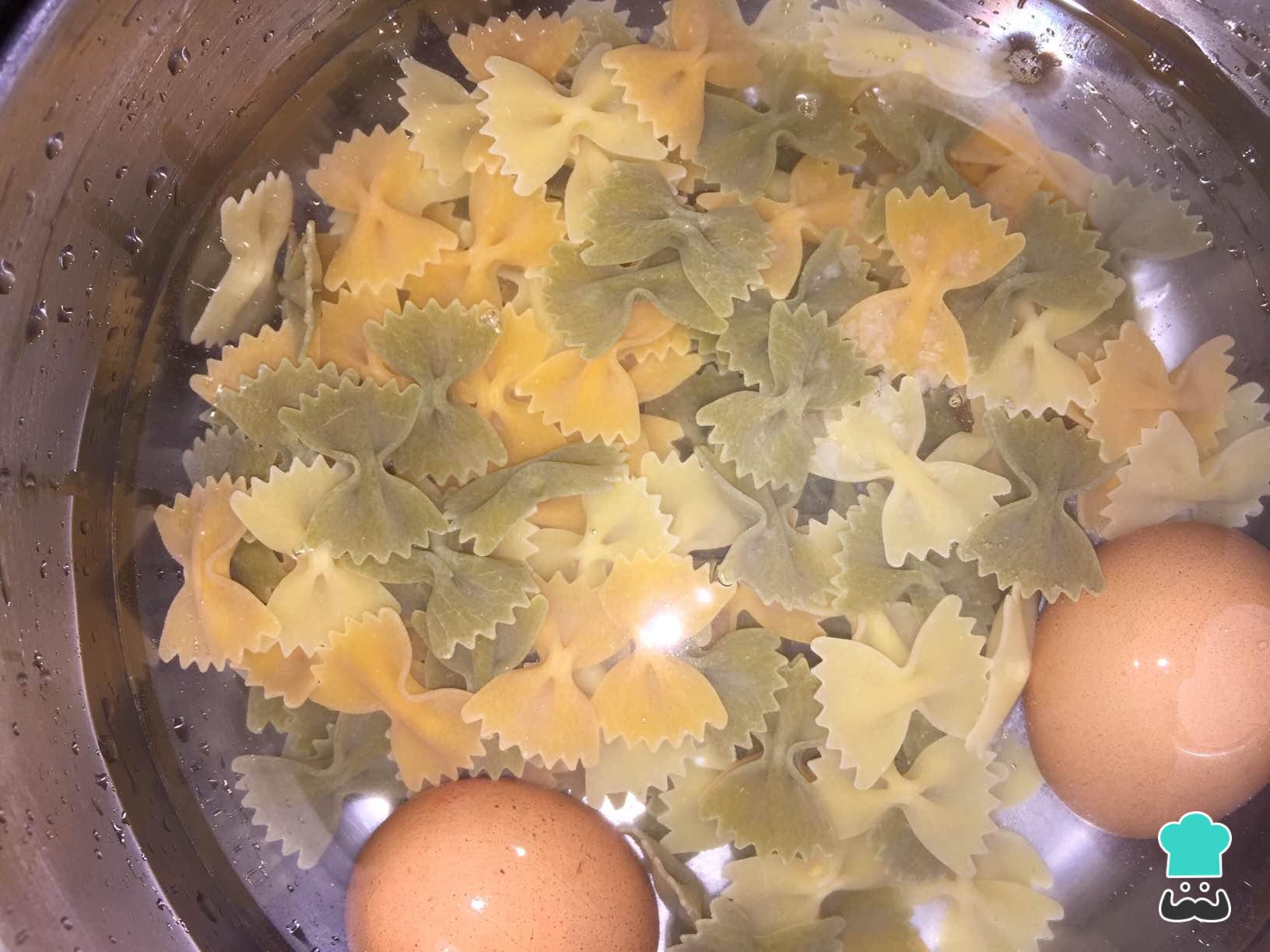 Em uma panela com água, coloque para cozer o macarrão gravata e os ovos. Tempere com sal e deixe cozer por 10 minutos.