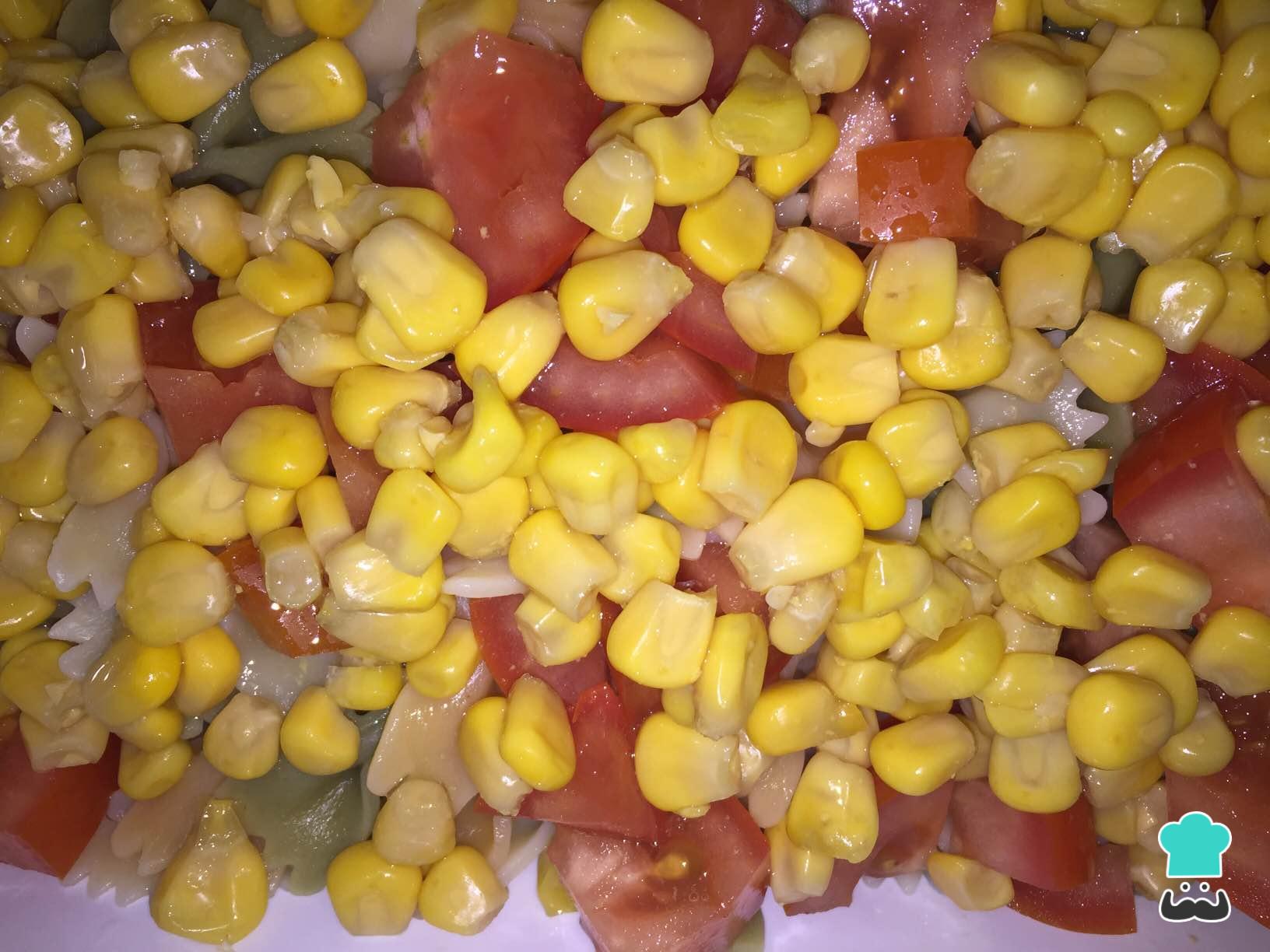 Corte o tomate aos quadrados e adicione à massa, juntamente com o milho.