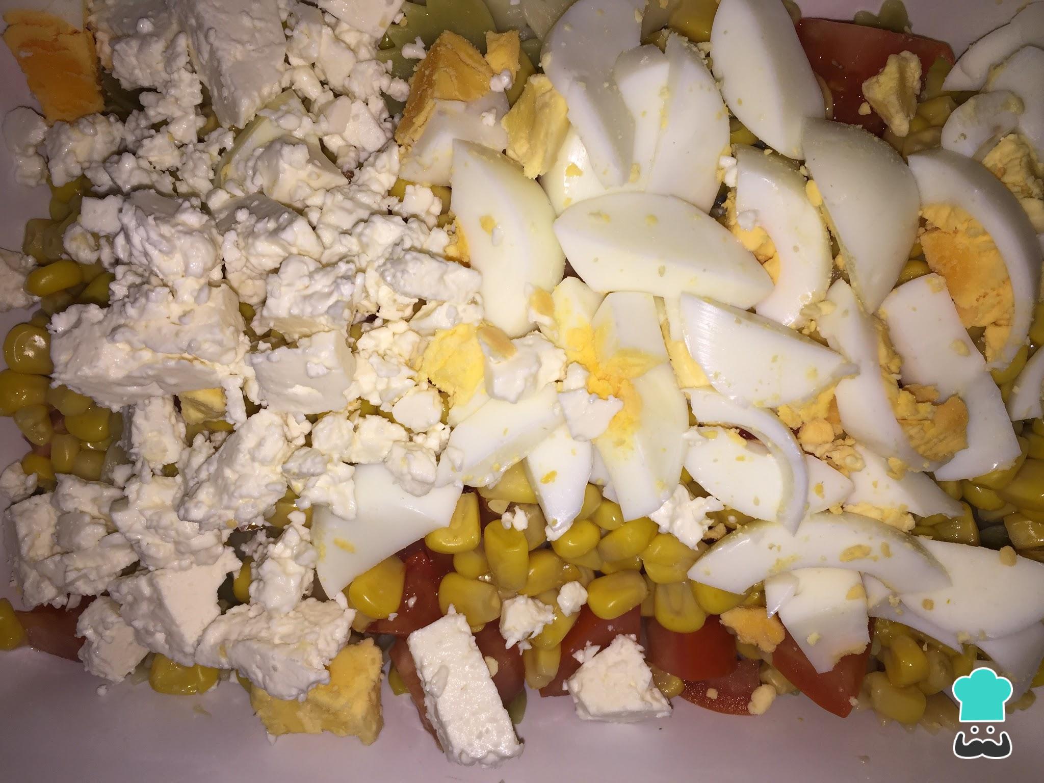 Descasque os ovos cozidos, corte-os em quadrados, bem como ao queijo feta e adicione-os à salada.