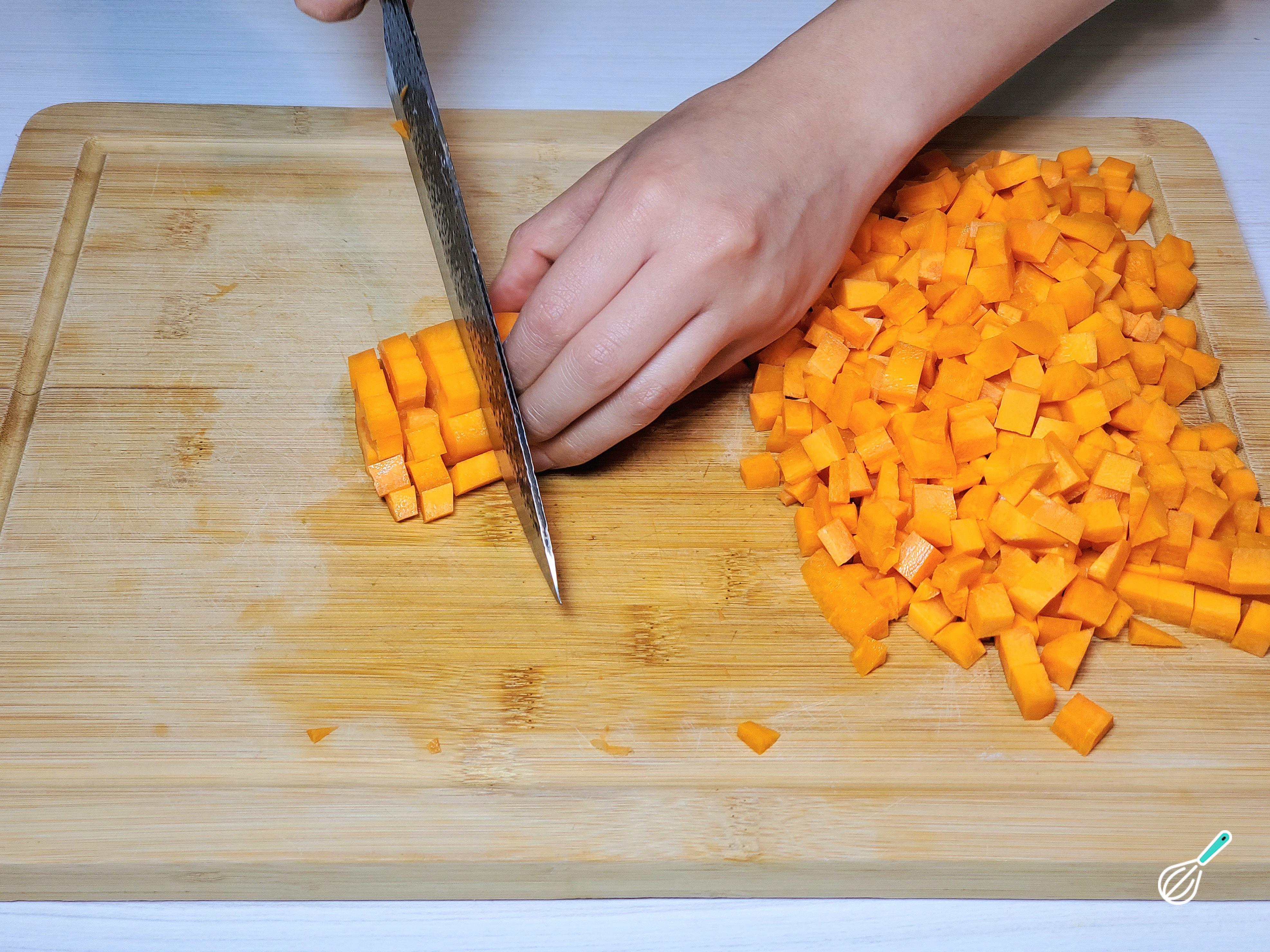 Comece descascando e cortando as cenouras em cubos de aproximadamente 1 cm. Para fazer isso, primeiro corte as extremidades das cenouras e, em seguida, corte-as em fatias de 1 cm de espessura. Empilhe essas fatias horizontalmente para cortá-las em palitos e, por fim, em cubos.