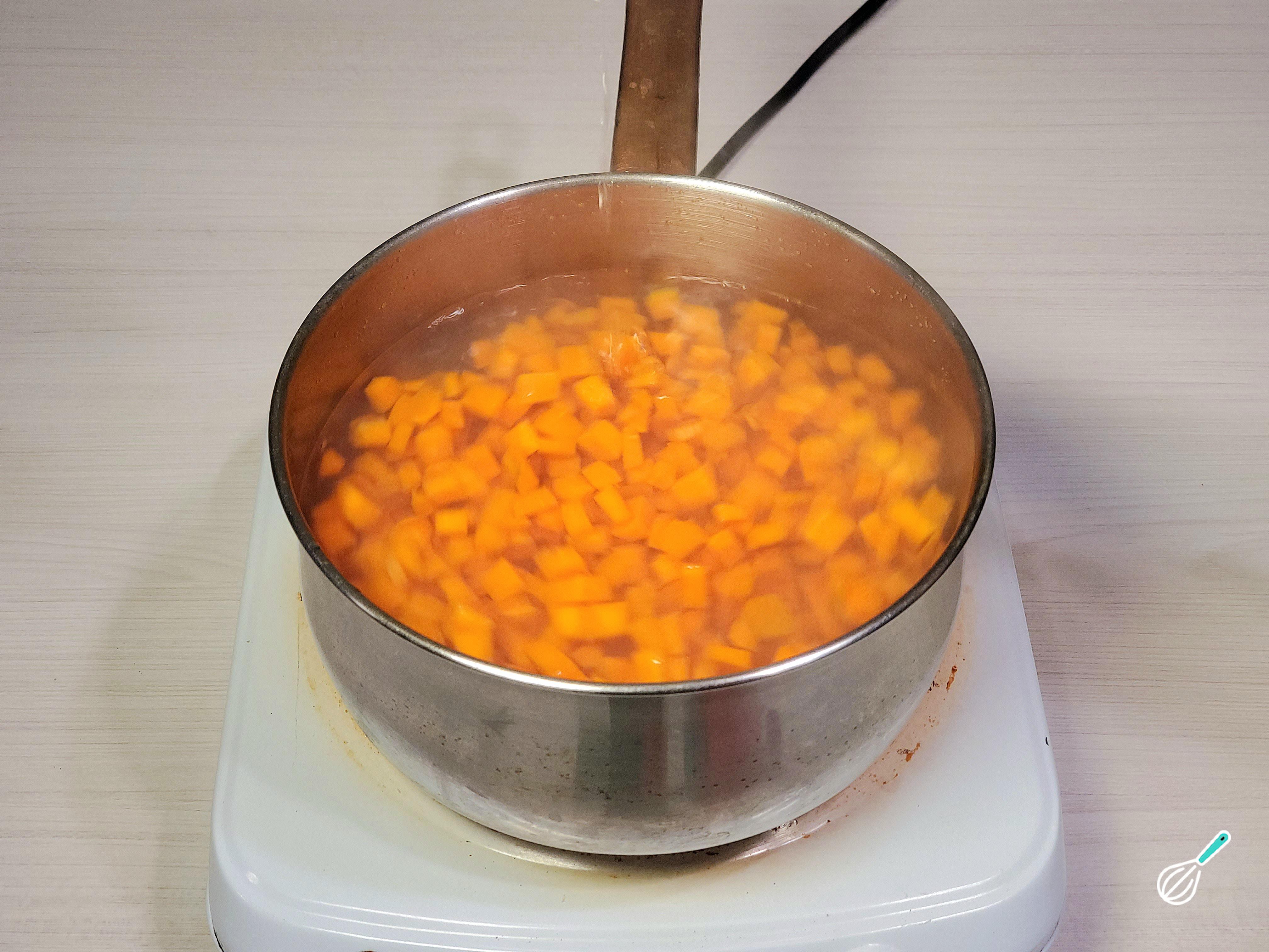 Separadamente, aqueça uma panela com bastante água. Deixe a água ferver e, depois que ferver, adicione o sal. Em seguida, adicione as cenouras e escalde ou ferva por 3 minutos. Retire-as quando estiverem al dente e passe-as por água gelada para interromper o cozimento.
