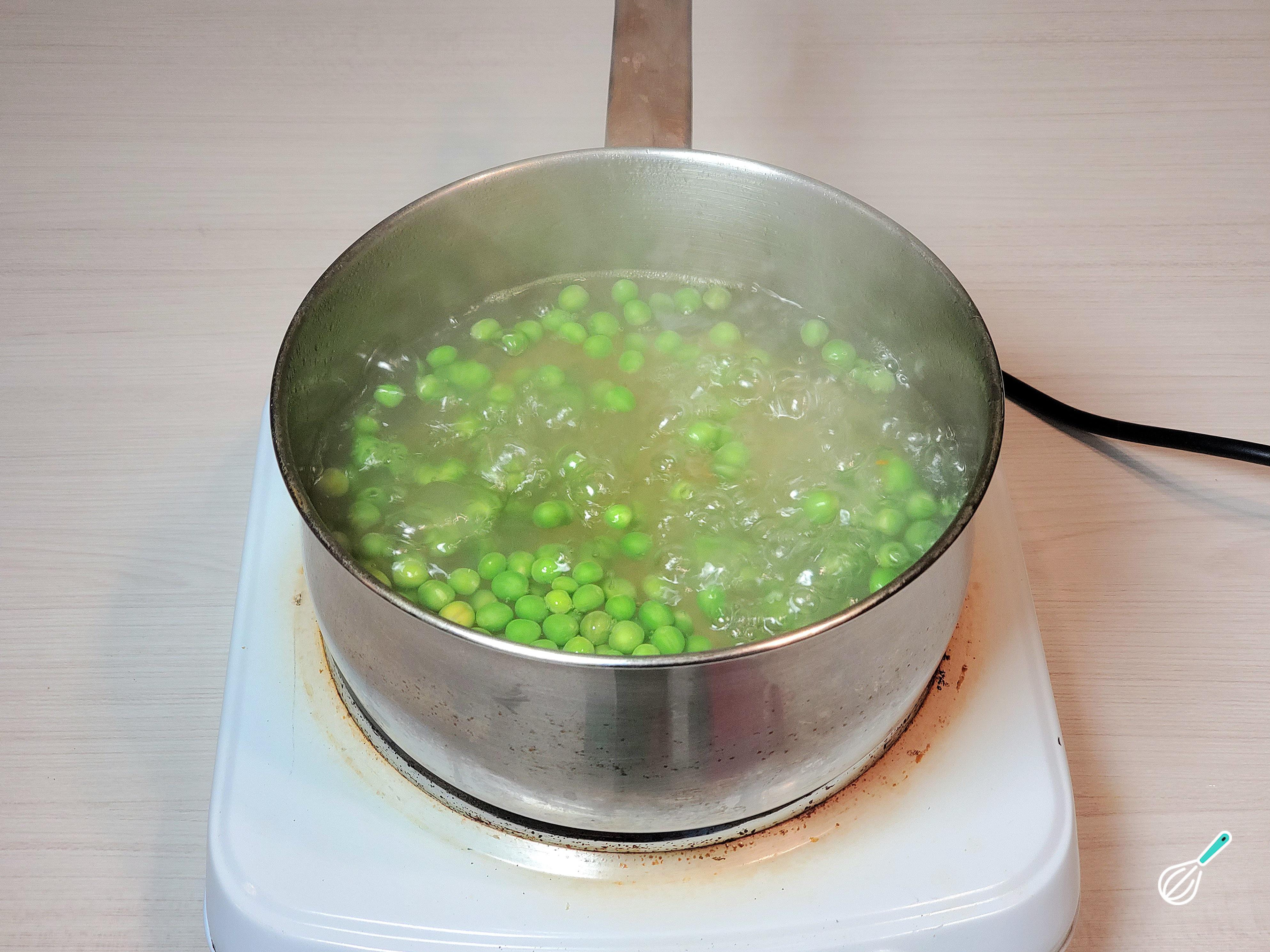Da mesma forma, escalde as ervilhas na mesma água e depois passe-as por água gelada para manter a cor verde.
