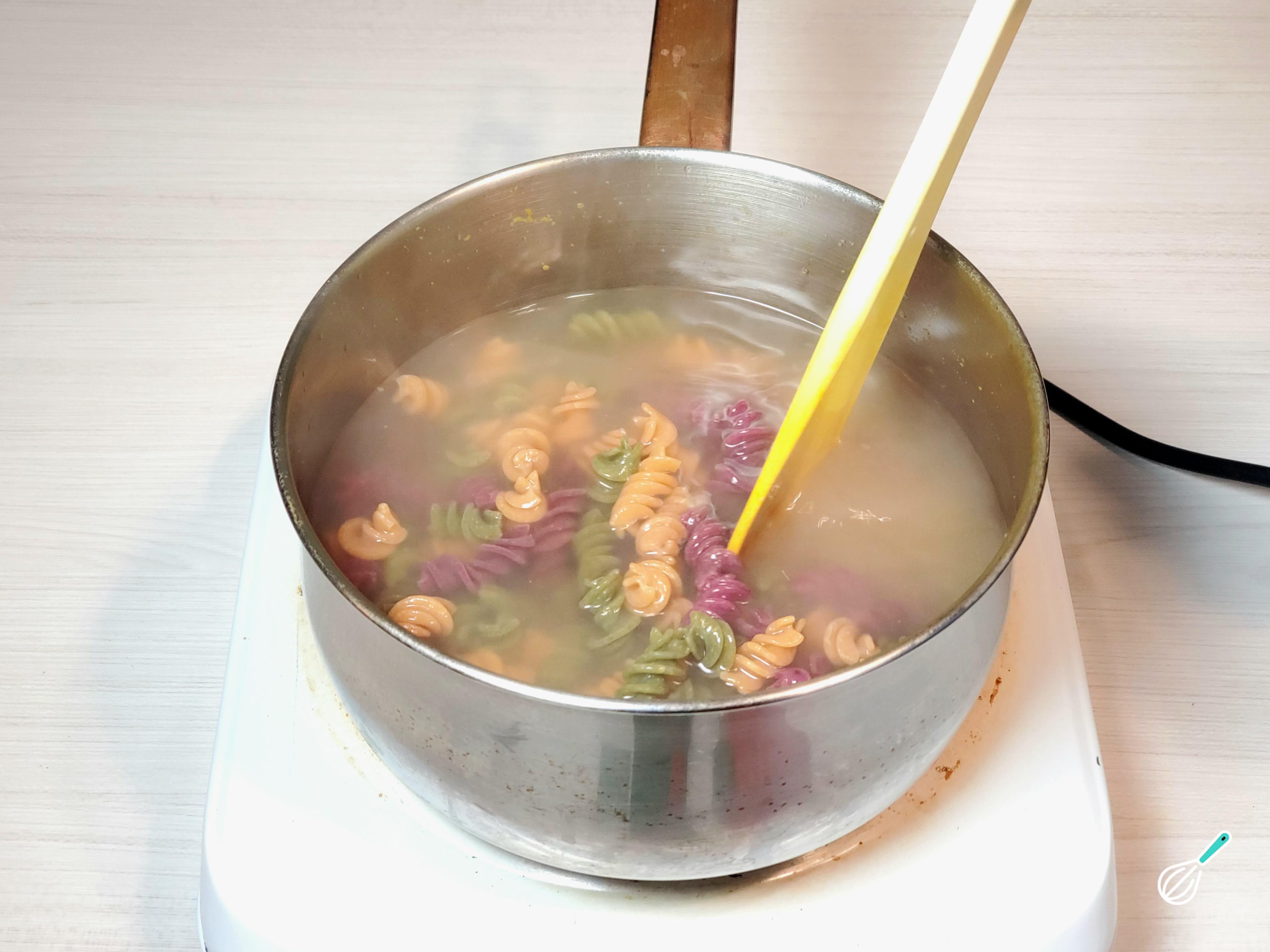 Adicione mais água à panela e um punhado de sal. Quando ferver novamente, adicione o macarrão e cozinhe até ficar al dente. Quando estiver pronto, escorra e coloque em uma tigela grande. Acrescente um bom fio de azeite de oliva e misture bem para evitar que grude. Deixe esfriar.
