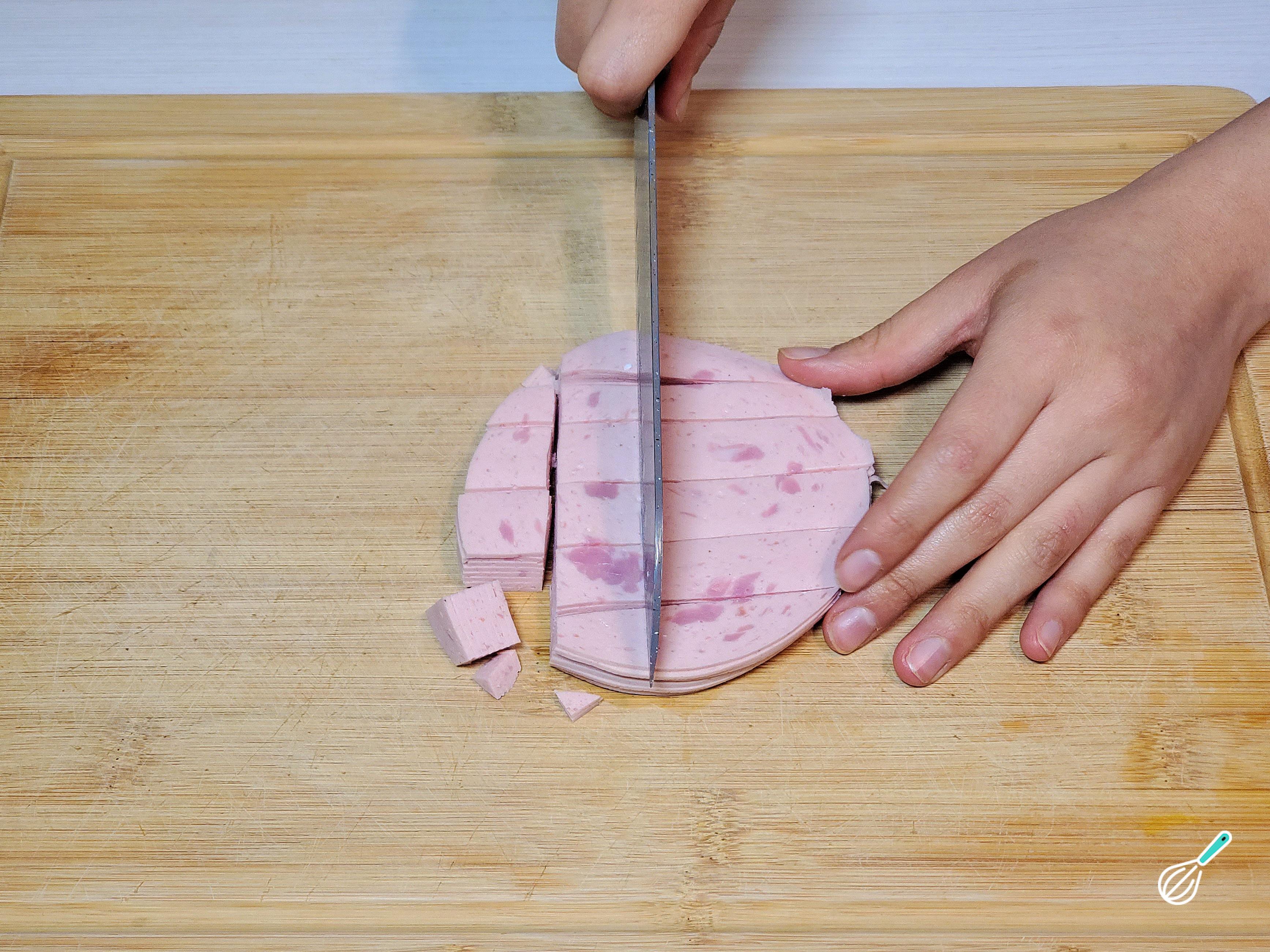 Antes de montar, corte o presunto e o queijo Edam em cubos grandes. Corte também as azeitonas verdes em fatias, caso não as tenha comprado prontas.