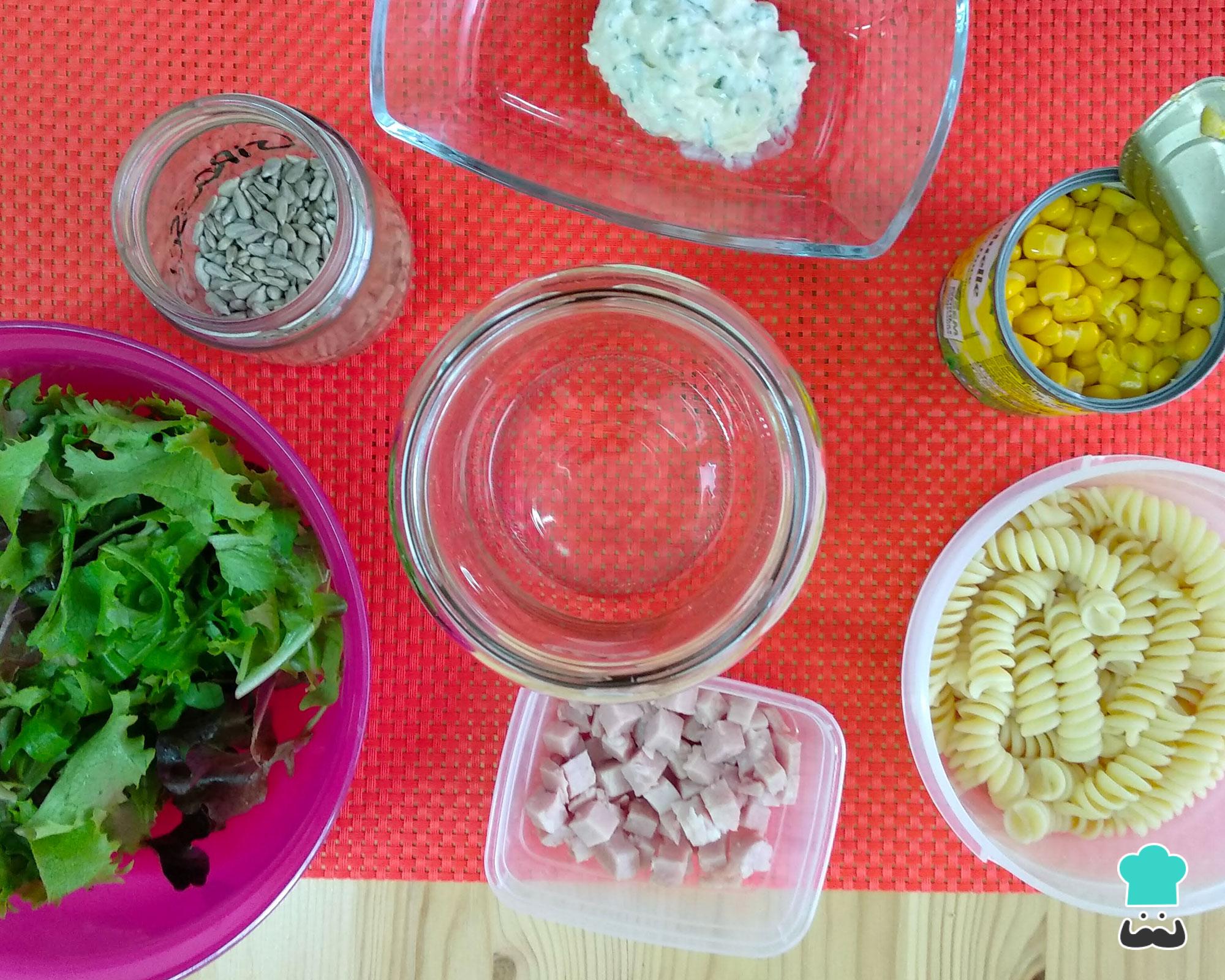 Junte todos os ingredientes indicado para preparar esta receita de salada no pote. Neste caso estou usando um pote de vidro para salada no pote mas, se você estiver preparando esta salada para vender, prefira usar um pote de plástico.