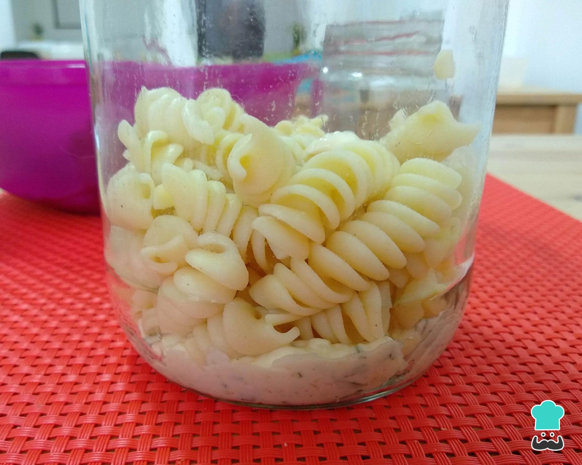 No fundo do pote coloque o molho de maionese de alho e, por cima dele, o macarrão.