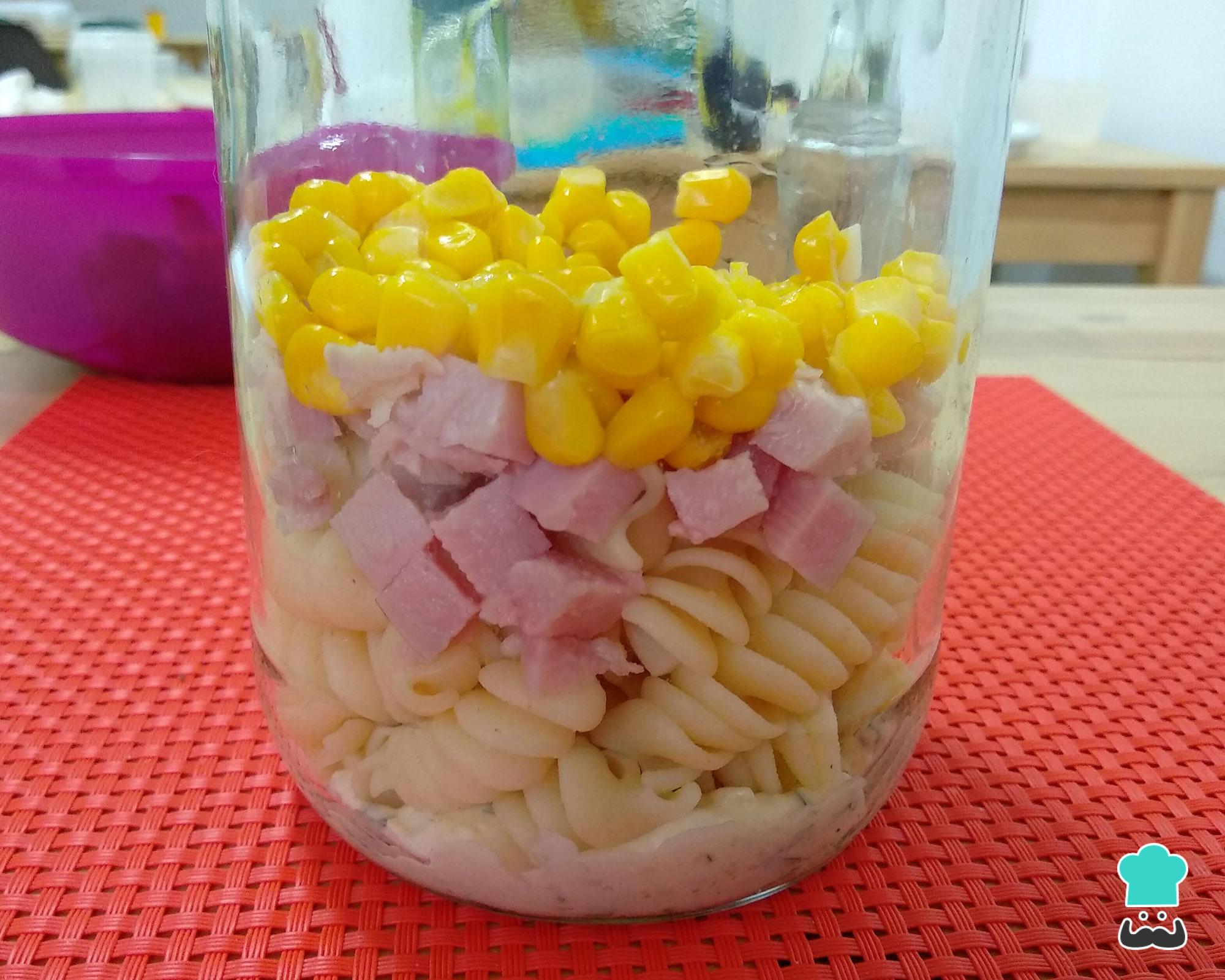- Salada no pote qual camada vai o macarrão? O macarrão vai sempre na segunda camada, após o molho. Isso é importante para evitar que o macarrão fique ressequido e também para evitar que ingredientes úmidos fiquem em contacto com o molho, o que poderia resultar em apodrecimento durante o armazenamento da salada de pote.