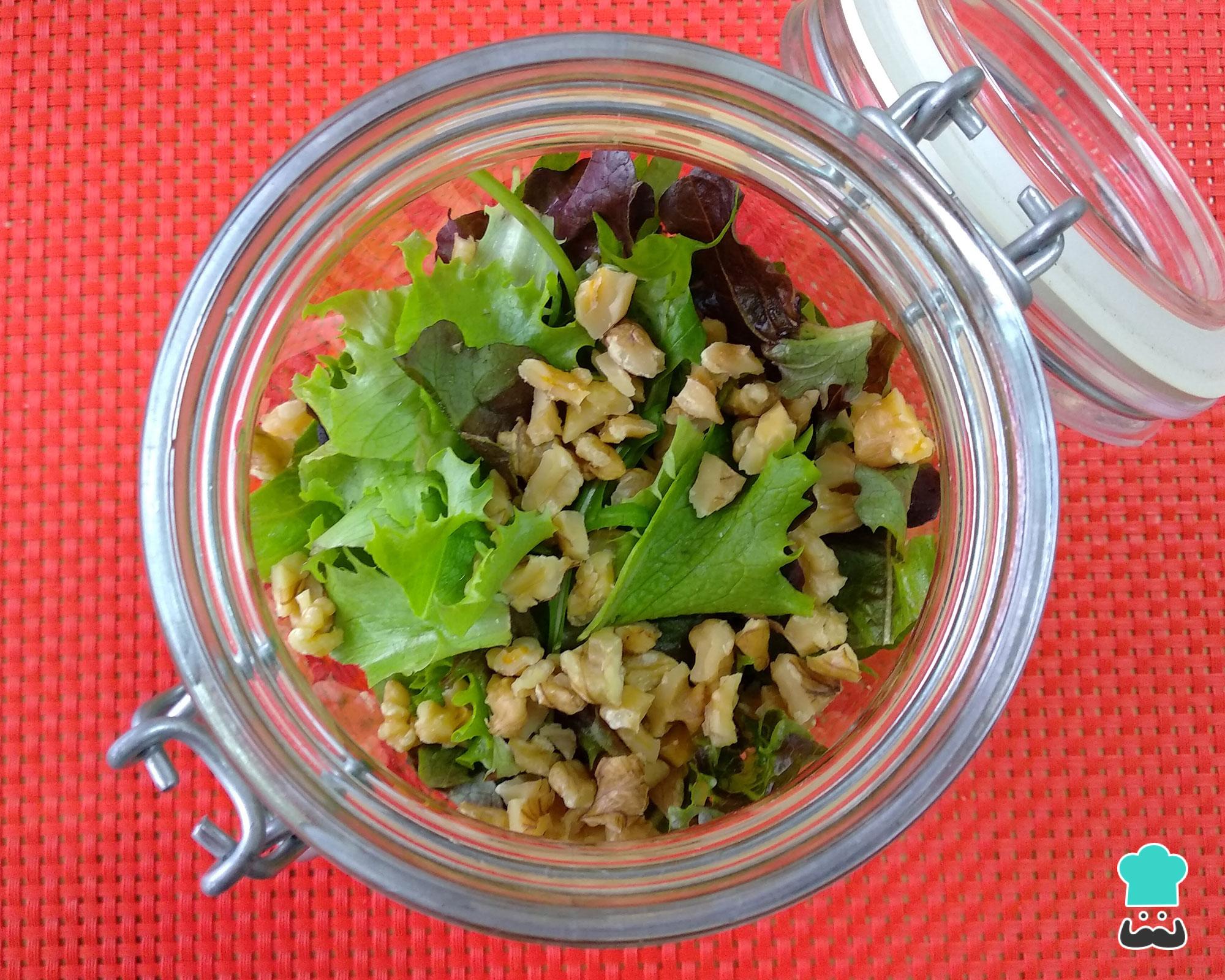 Complete essa salada no pote saudável com o mix de folhas e sementes de girassol ou nozes picadas.