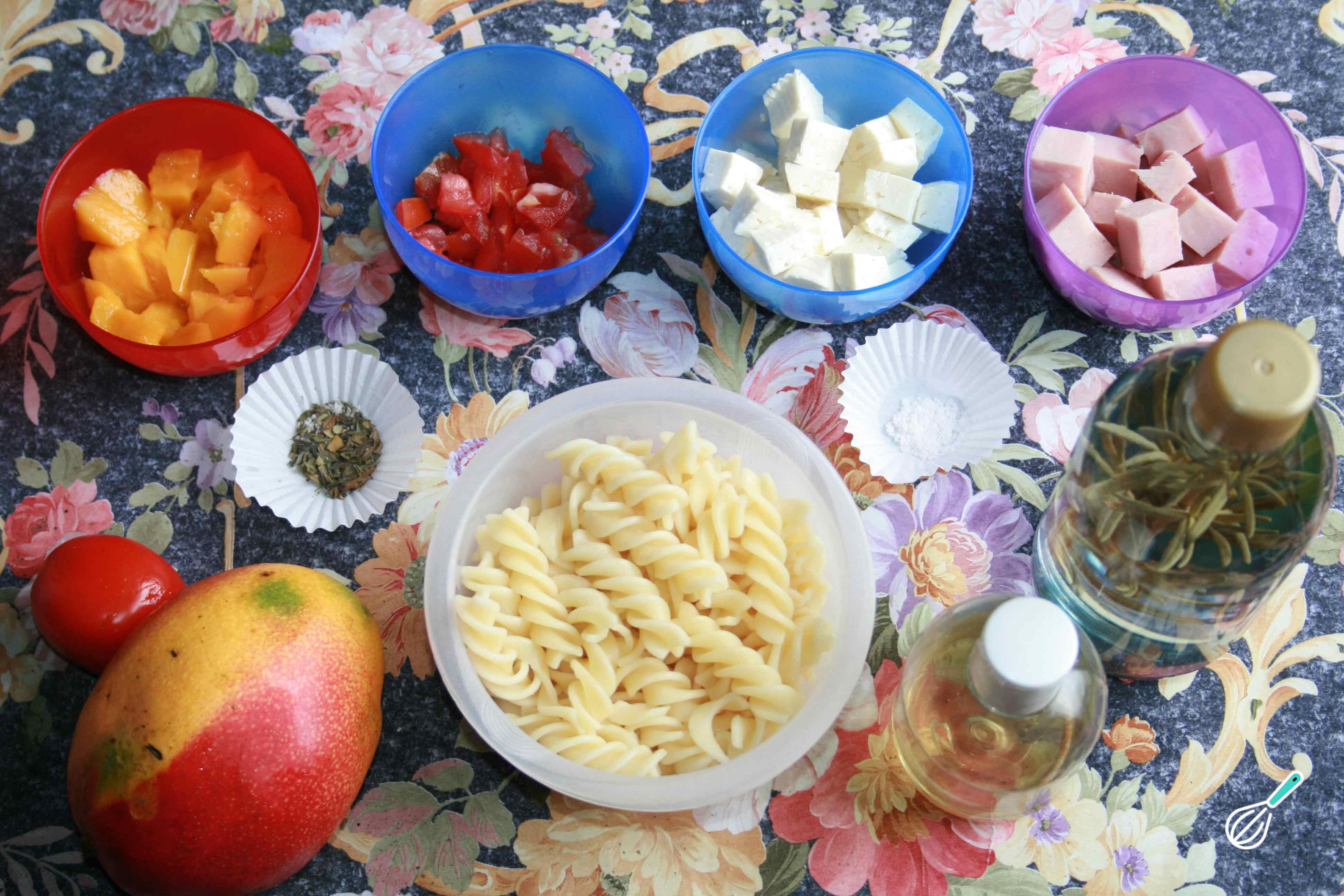 Num bowl misture o macarrão, o presunto, o queijo, o tomate e a manga, com cuidado para não amassar os ingredientes.